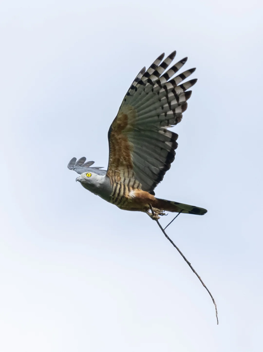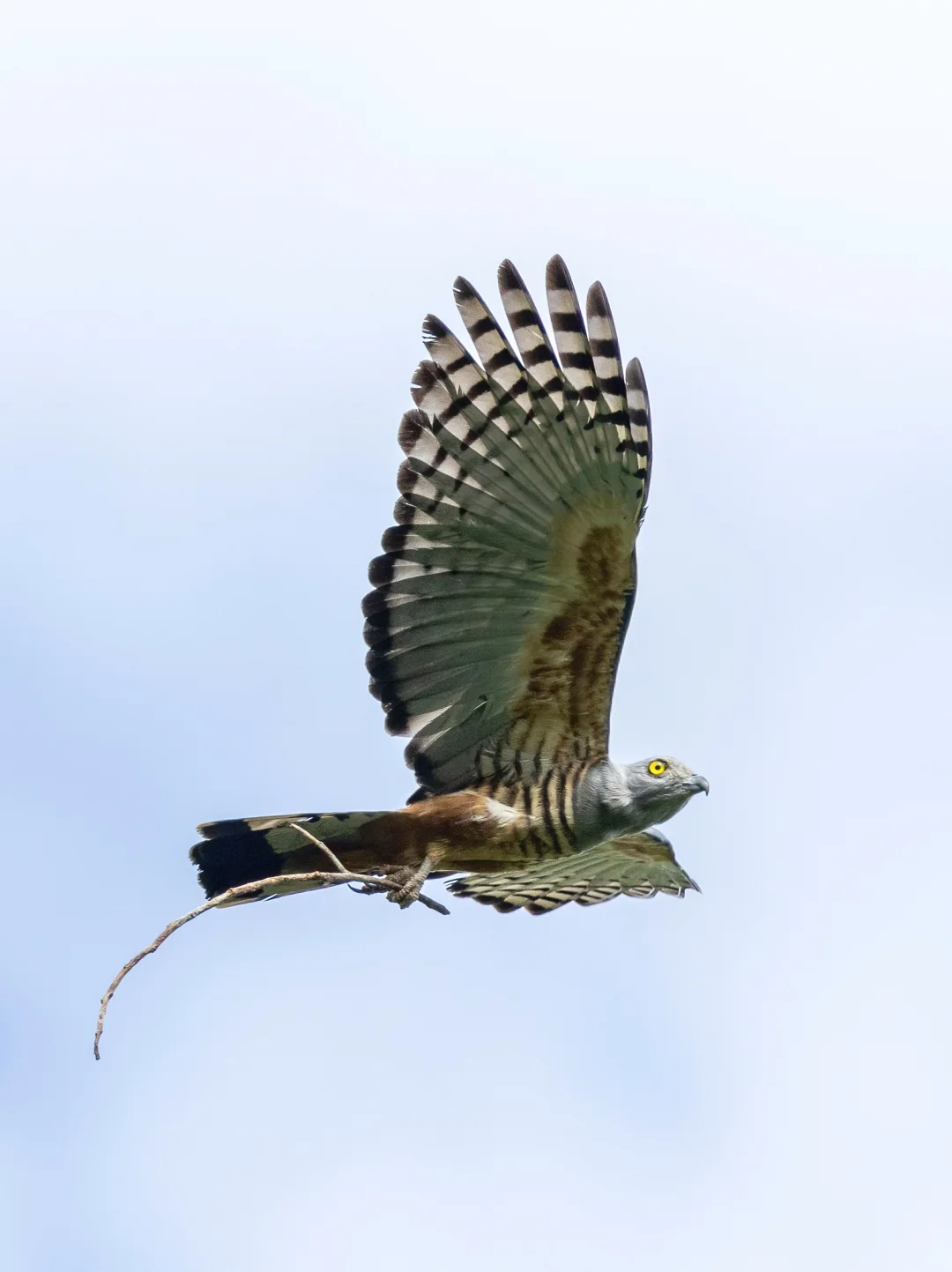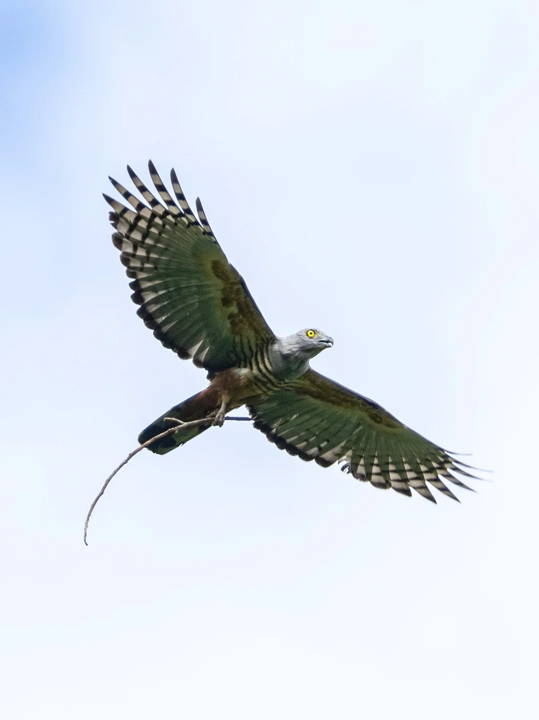 原创拍摄于2024.09 凤头鹃隼,鹰形目鹰科鹃隼属。全世界一共5种鹃隼,我国有褐冠鹃隼和黑冠鹃隼,凤头鹃隼主要分布在澳新界,所以英文名直译又叫太平洋鹃隼。 凤头鹃隼是中型猛禽,翼展大概80-105厘米,黑色枕冠和明亮的黄色眼睛非常独特。它们的肩部是棕色的,下腹有鹃隼都有的黑白色条纹。 当时我们在森林中走到一个较为开阔的小河边,就听到了这只凤头鹃隼的叫声,抬头寻找,果然就飞了出来,脚上还抓着一支树枝,像是去筑巢的。 拍摄于卫古岛。
