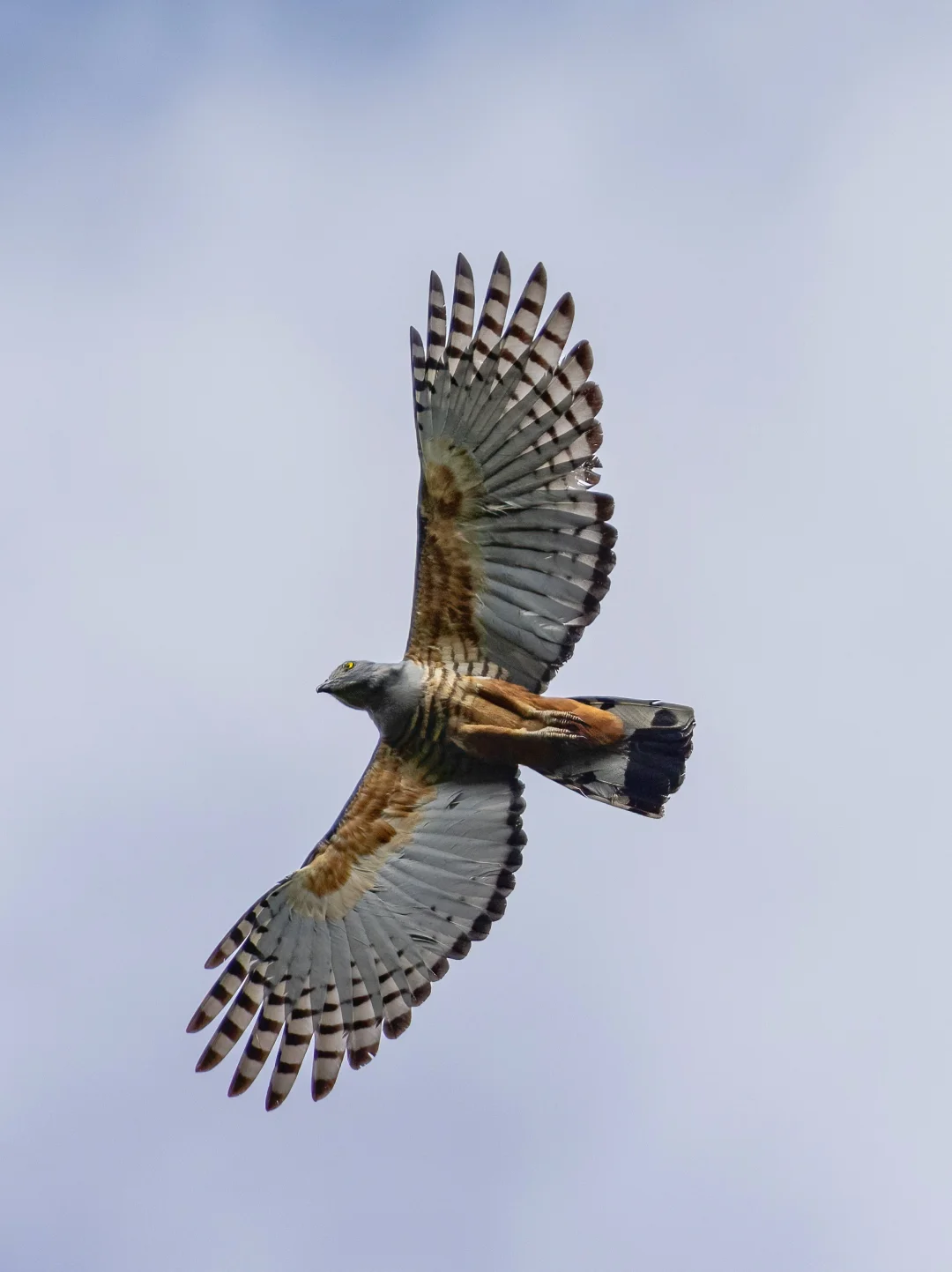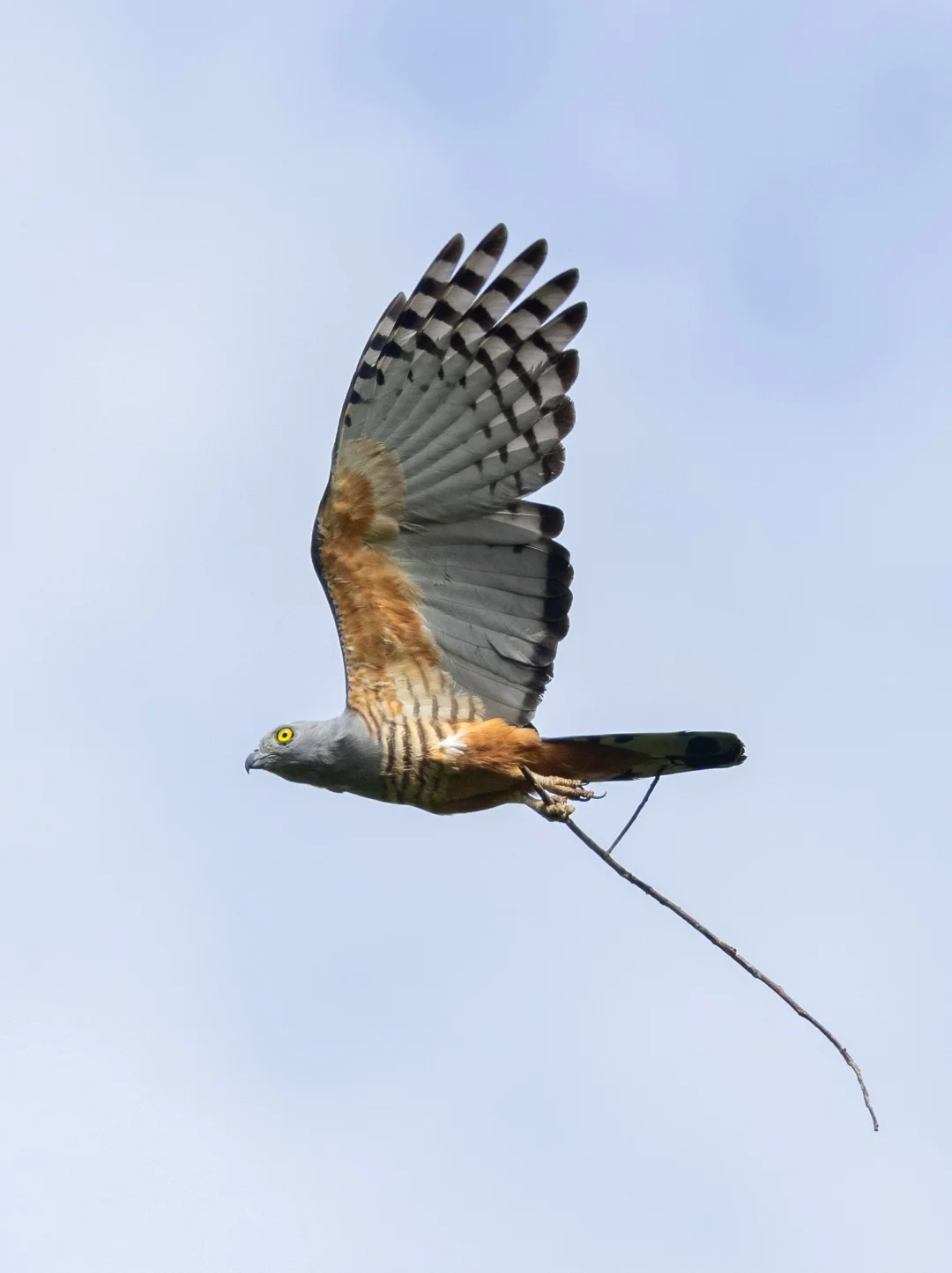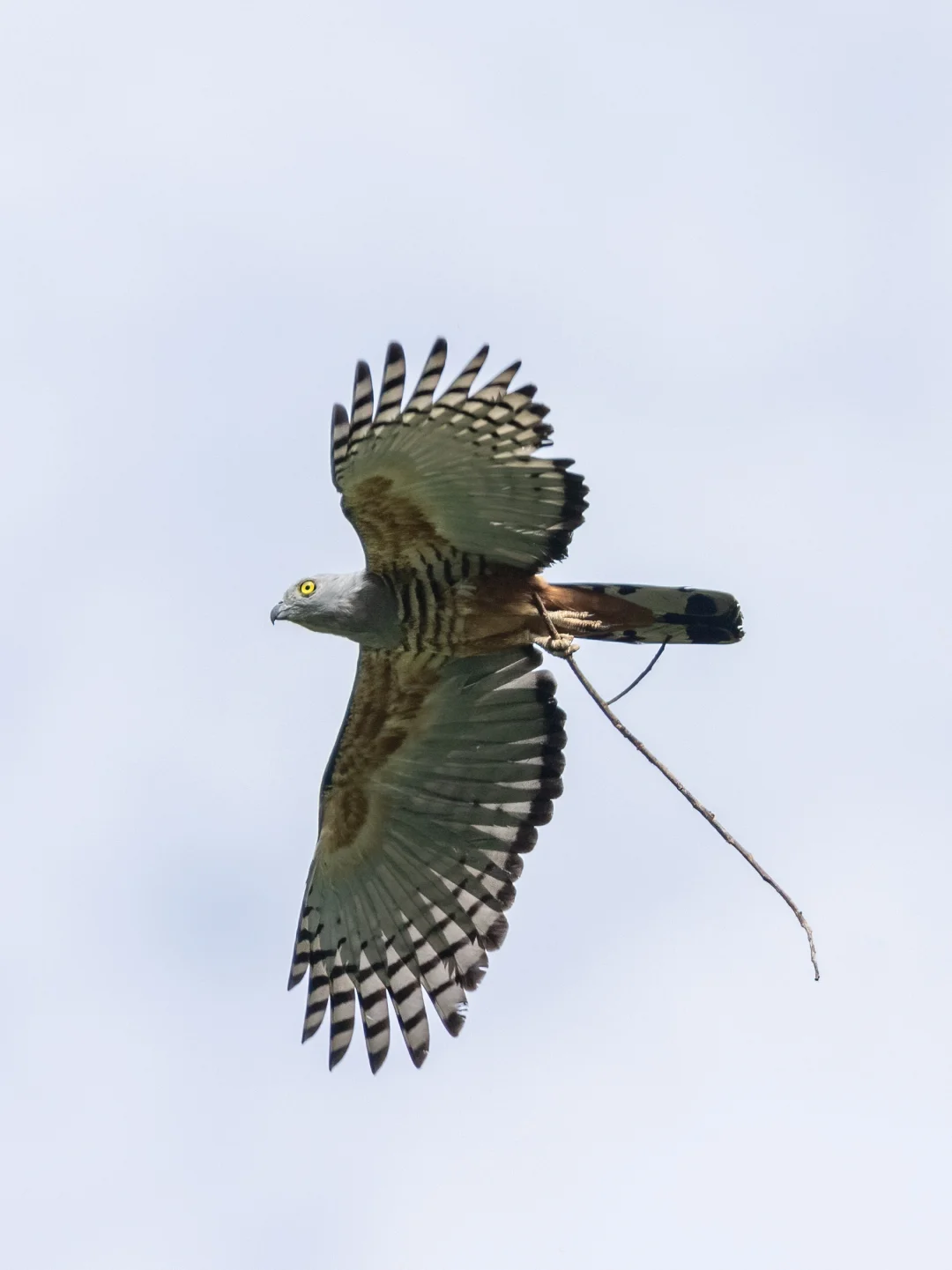 原创拍摄于2024.09 凤头鹃隼,鹰形目鹰科鹃隼属。全世界一共5种鹃隼,我国有褐冠鹃隼和黑冠鹃隼,凤头鹃隼主要分布在澳新界,所以英文名直译又叫太平洋鹃隼。 凤头鹃隼是中型猛禽,翼展大概80-105厘米,黑色枕冠和明亮的黄色眼睛非常独特。它们的肩部是棕色的,下腹有鹃隼都有的黑白色条纹。 当时我们在森林中走到一个较为开阔的小河边,就听到了这只凤头鹃隼的叫声,抬头寻找,果然就飞了出来,脚上还抓着一支树枝,像是去筑巢的。 拍摄于卫古岛。