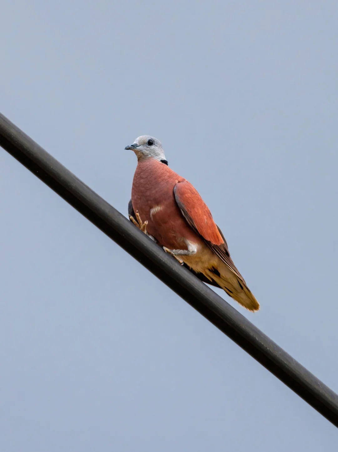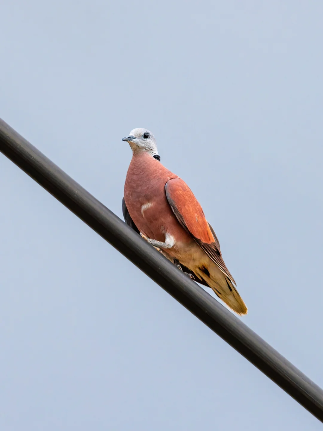原创拍摄于2024.07 火斑鸠,鸽形目鸠鸽科斑鸠属。是火红色的小型鸽子,在我国南方大部可见留鸟,北方大部是夏候鸟。雄鸟头部灰蓝色,全身红棕色,颜色很显眼,带个黑领子,也很独特。雌鸟和灰斑鸠比较相似。 火斑鸠在东南亚很多地区比较多,但是在我国你要说常见呢,也不那么容易。 这次正好撞见一只火斑鸠在电线上漫步,还挺可爱的。