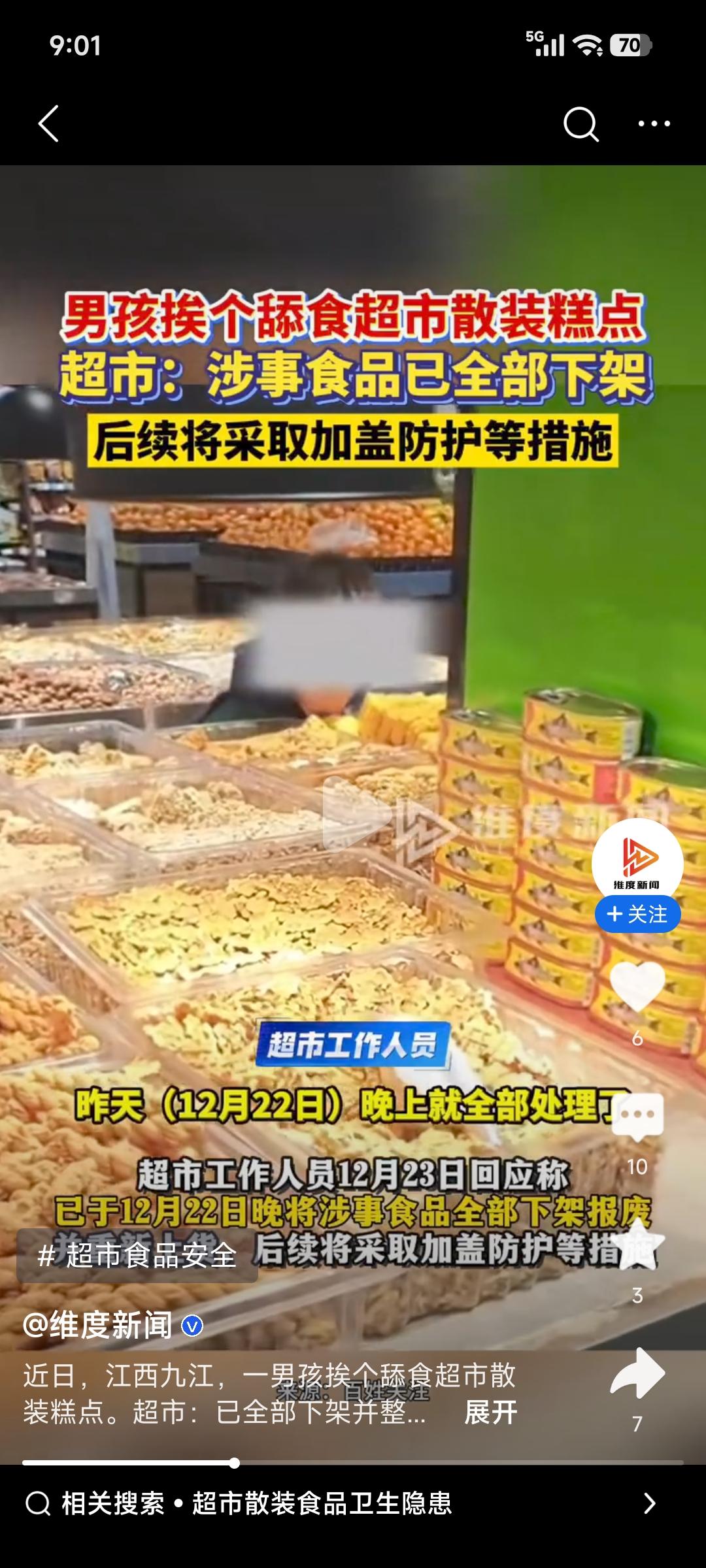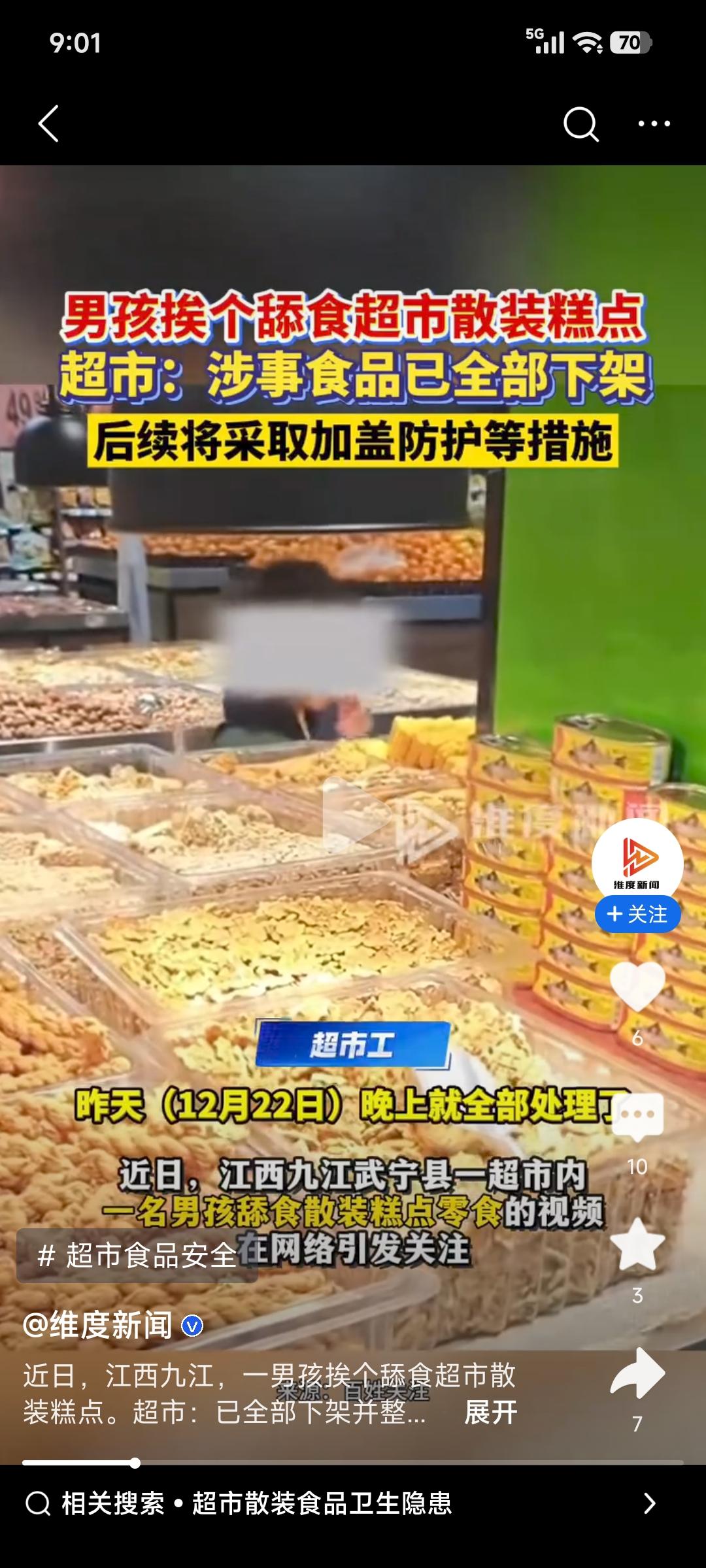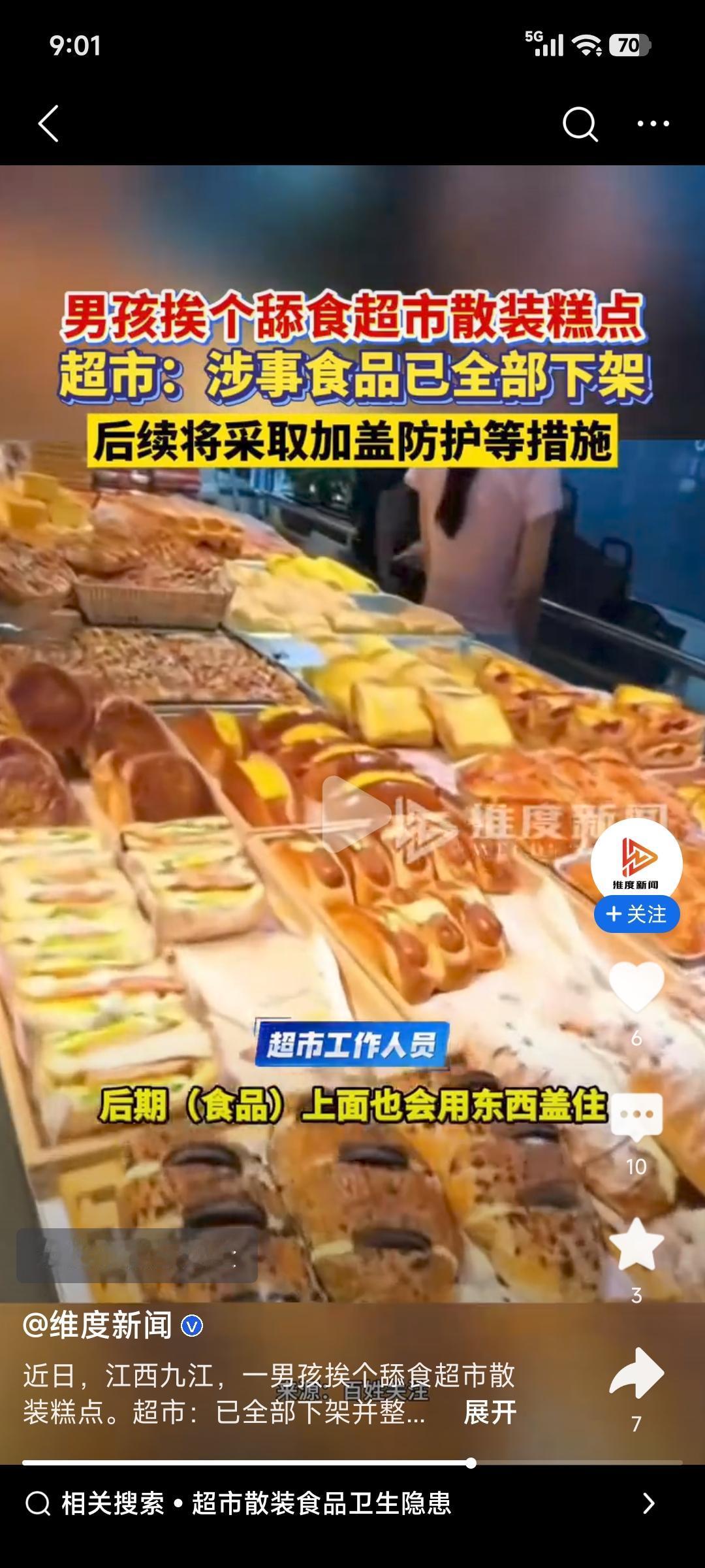 江西九江一超市里,小男孩踮脚挨个舔散装糕点,旁边家长还不管,这视频在网上一曝光,网友直接炸锅。大家觉得这孩子没教养,把整柜蛋糕都污染了,踩碎公共道德底线。毕竟散装食品靠大家自觉,这么一整别人咋买啊。 不过,舆论后来反转了。有人说孩子小,过度骂也没用。关键是超市监管缺位,按规定散装食品得有防护、专人看管,可蛋糕完全敞着。家长监护也失职,让公共规则教育打折扣。最后超市下架整改,家长道歉赔偿,这才是该有的解决态度。咱气的不是孩子犯错,而是公共卫生和规则意识被忽视。