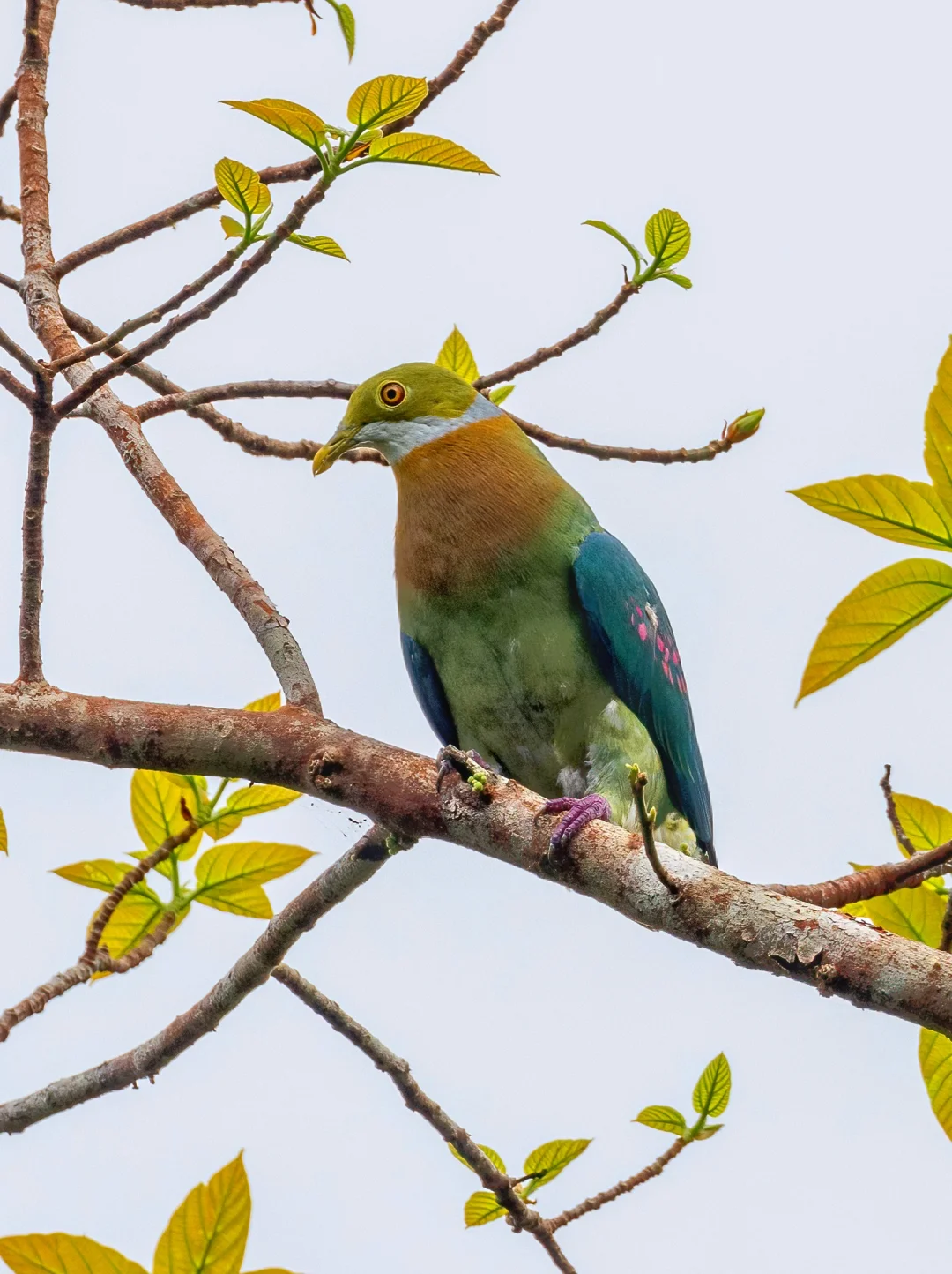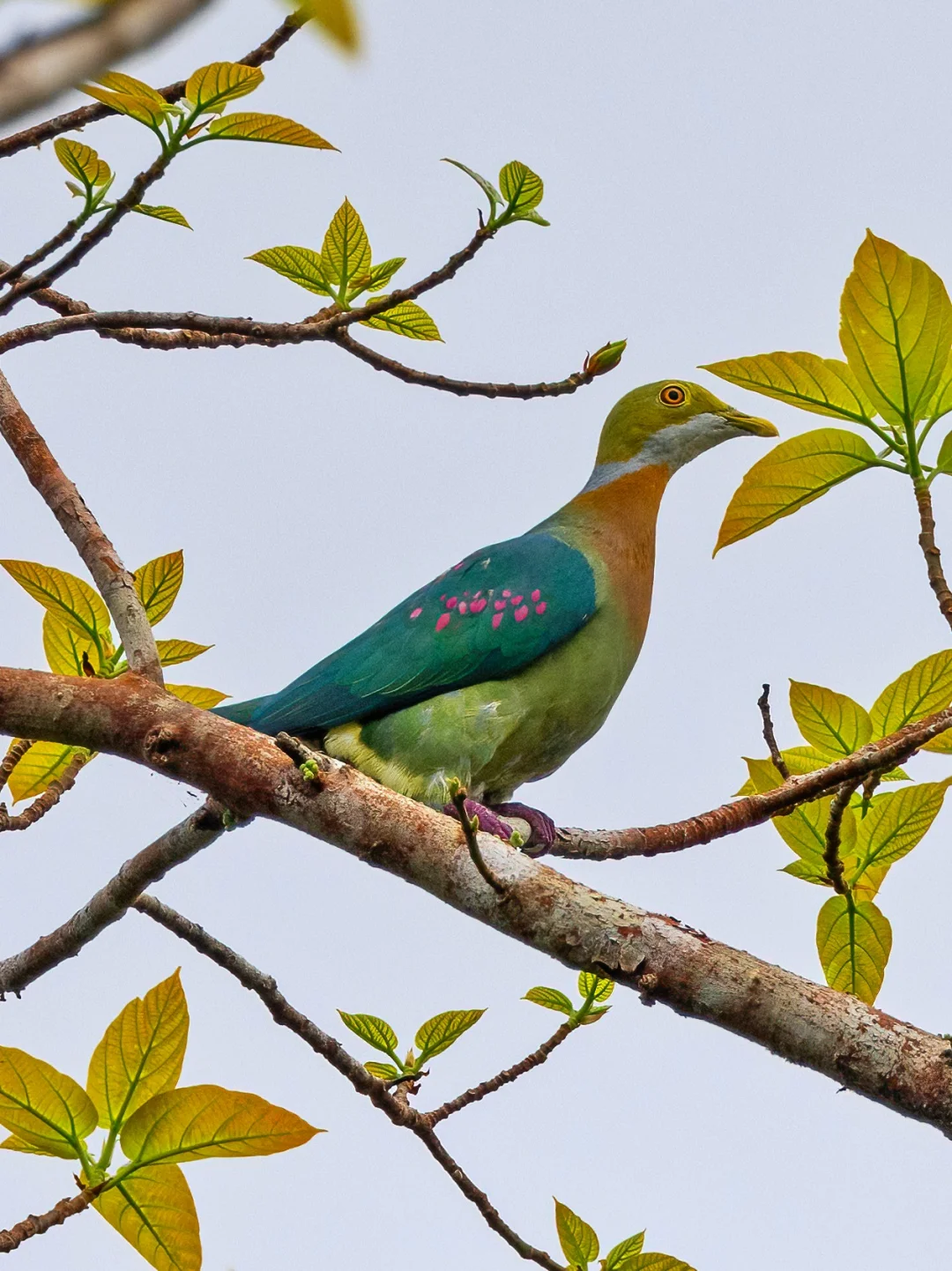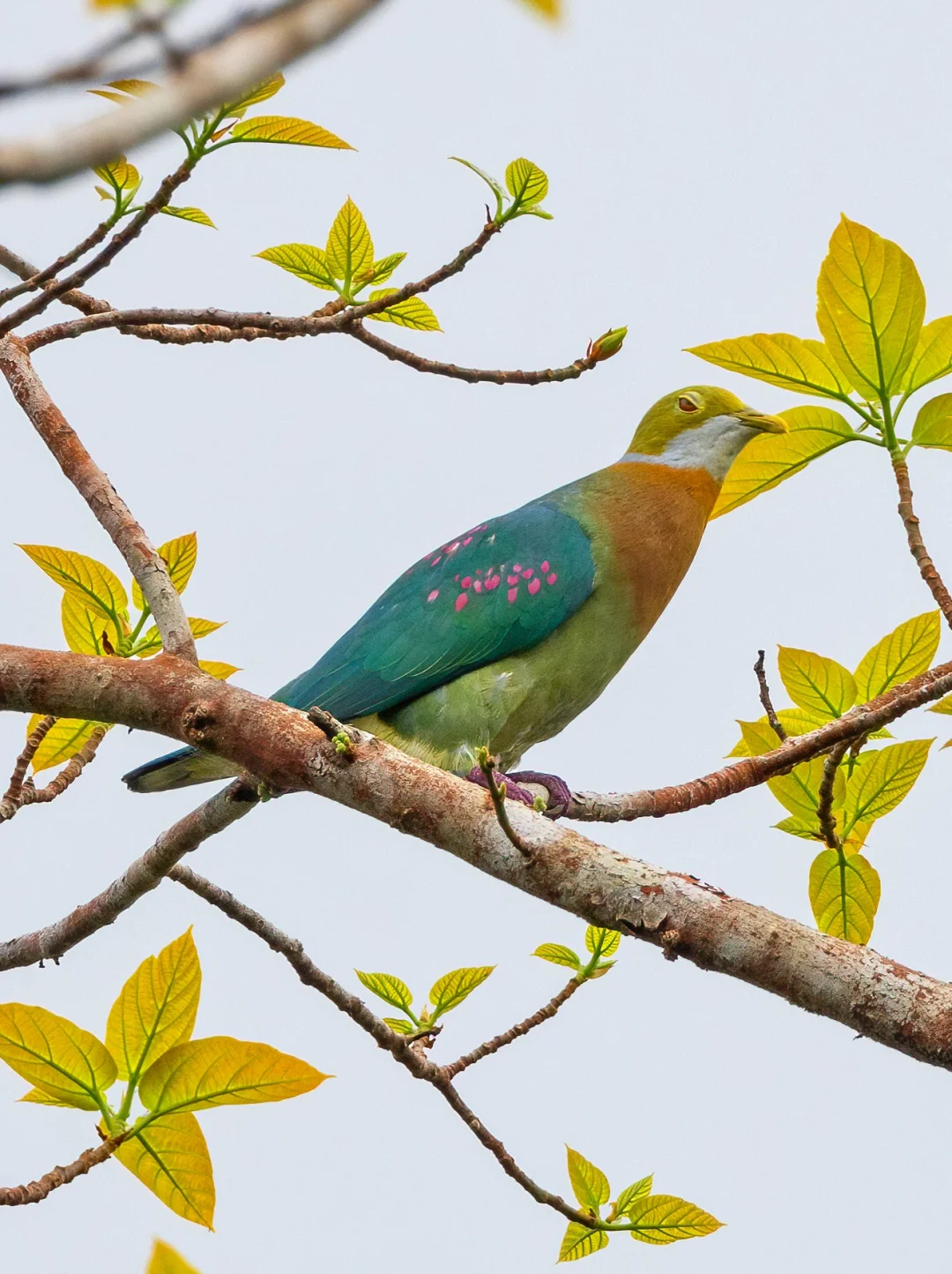 这鸽子身上有漂亮的粉色绣花:粉斑果鸠