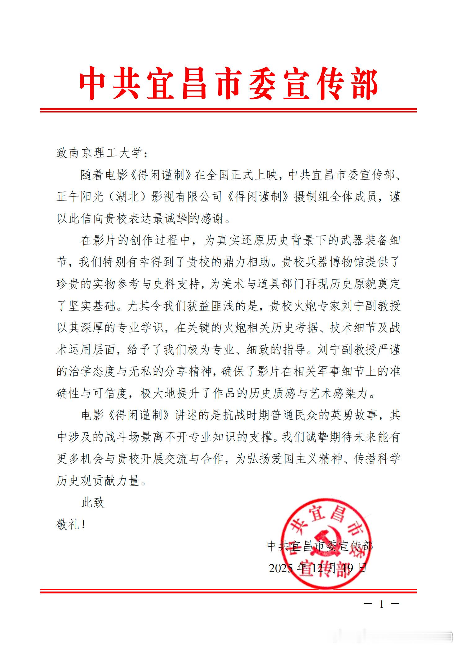 中共宜昌市委宣传部给南京理工大学发来感谢信了,感谢学校为《得闲谨制》军事细节还原提供的专业支持,这很谨制!