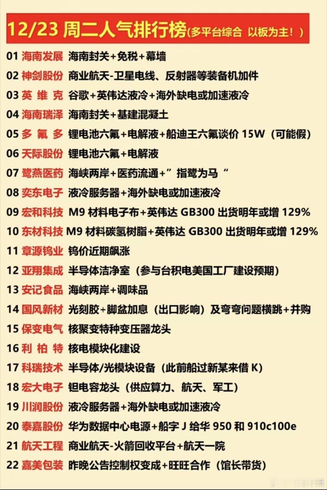 12月23日(周二)涨停人气龙虎榜聚焦方向1. 六氟磷酸锂、电解液2. 液冷服务器3. M9材料、英伟达产业链4. 可控核聚变5. 商业航天、火箭回收