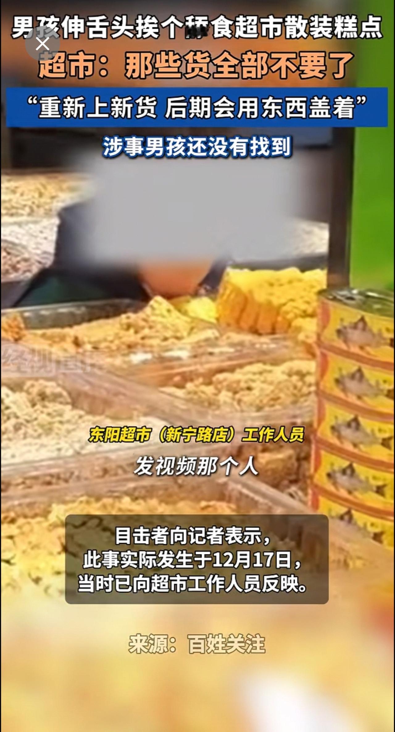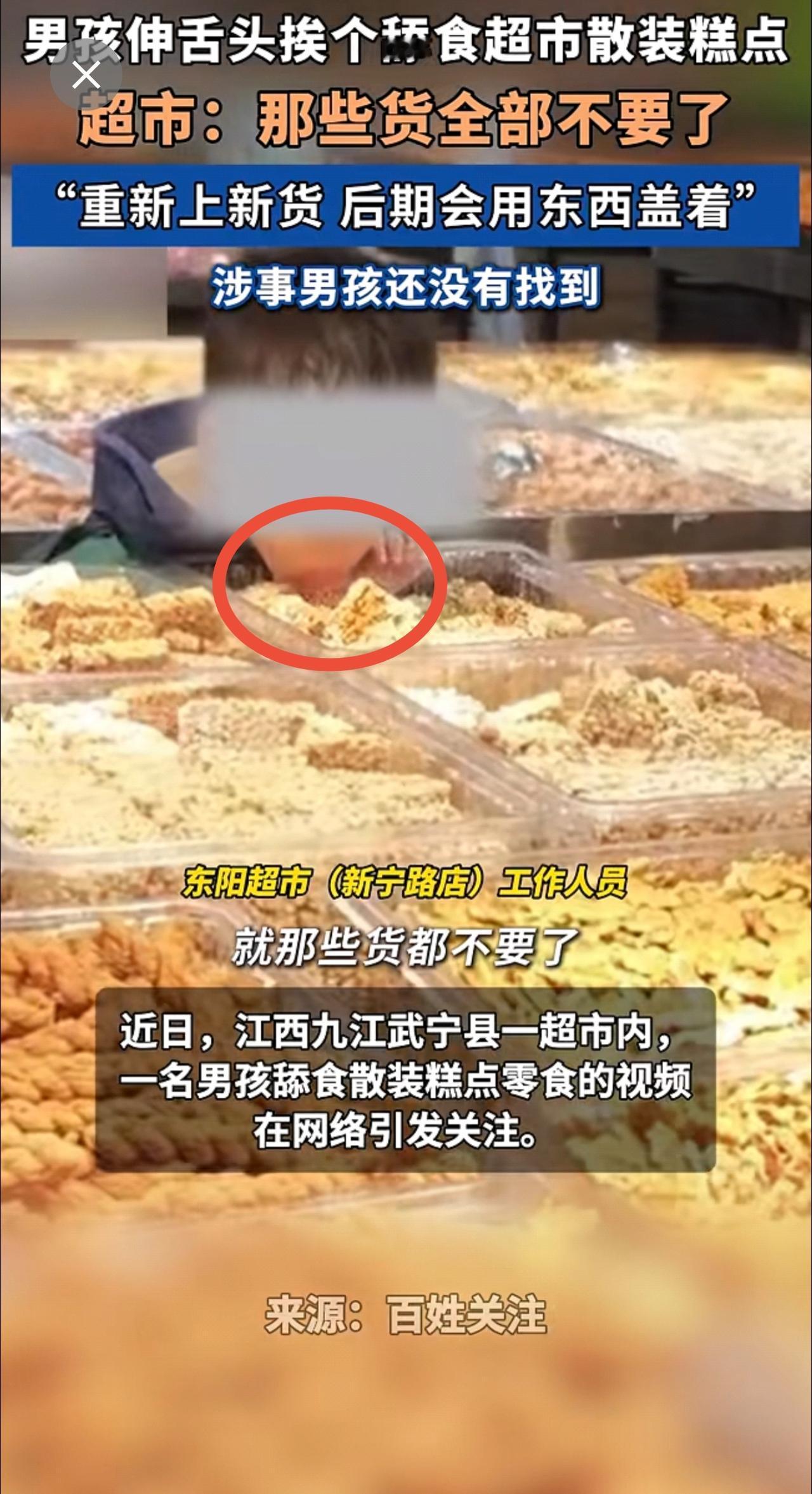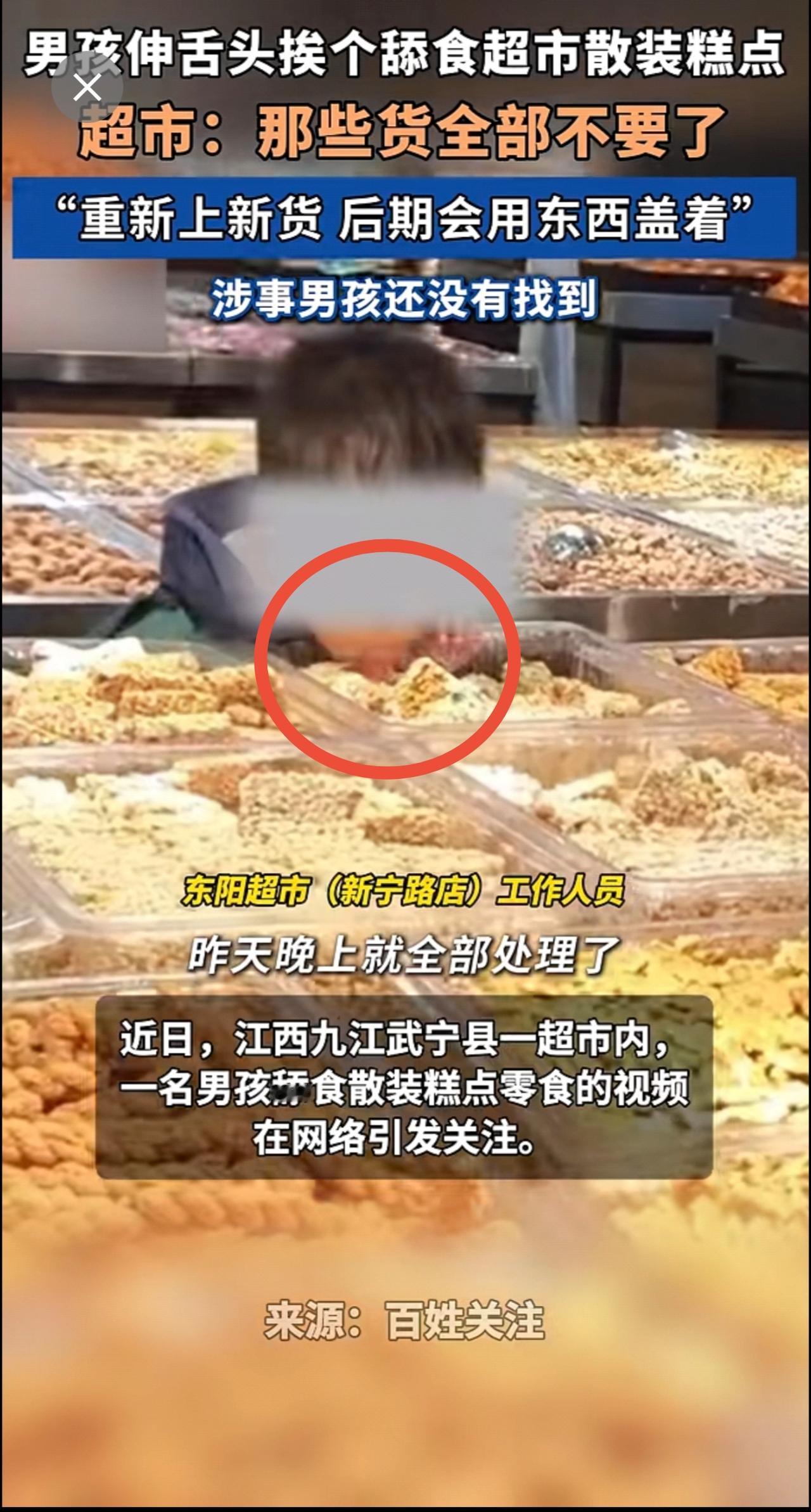男孩伸舌头挨个舔食超市散装糕点,超市:“那些货全部不要了,重新上新货,后期会用东西盖着。”涉事男孩还没有找到。