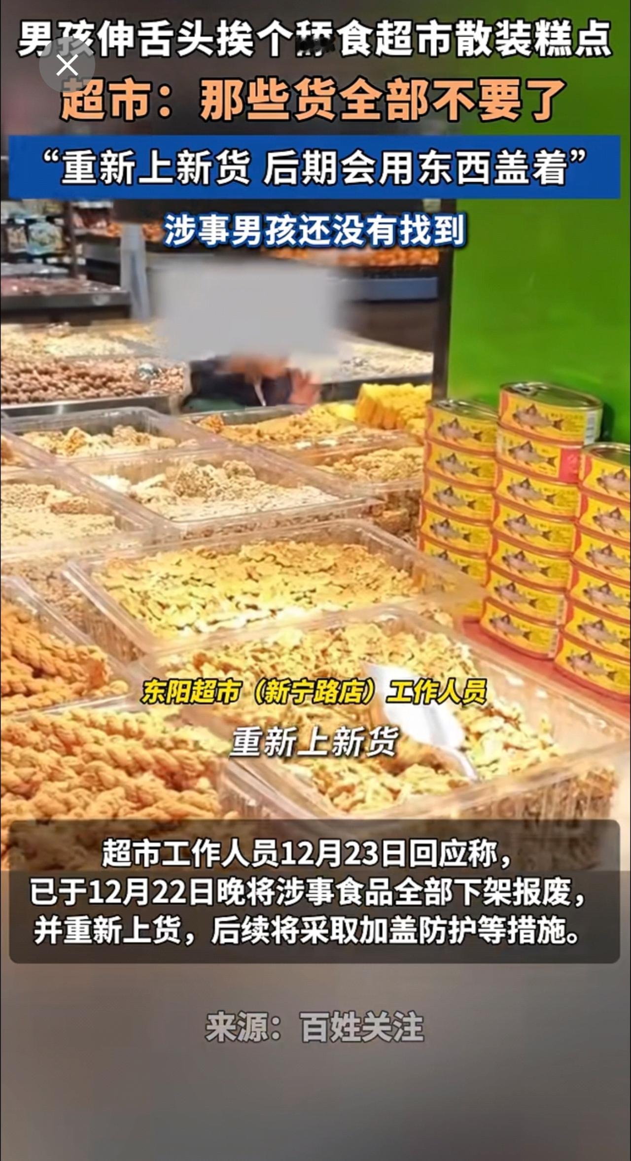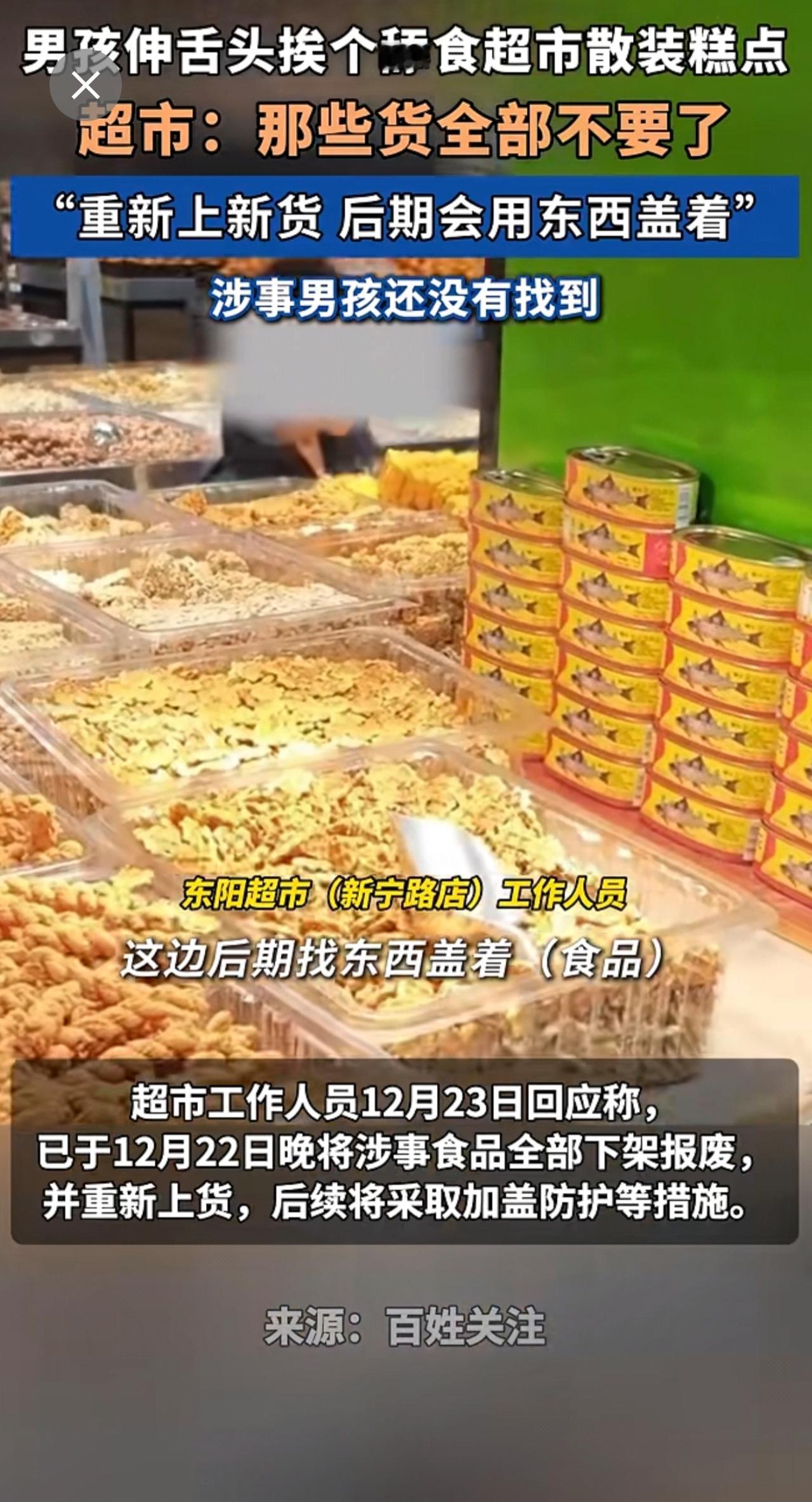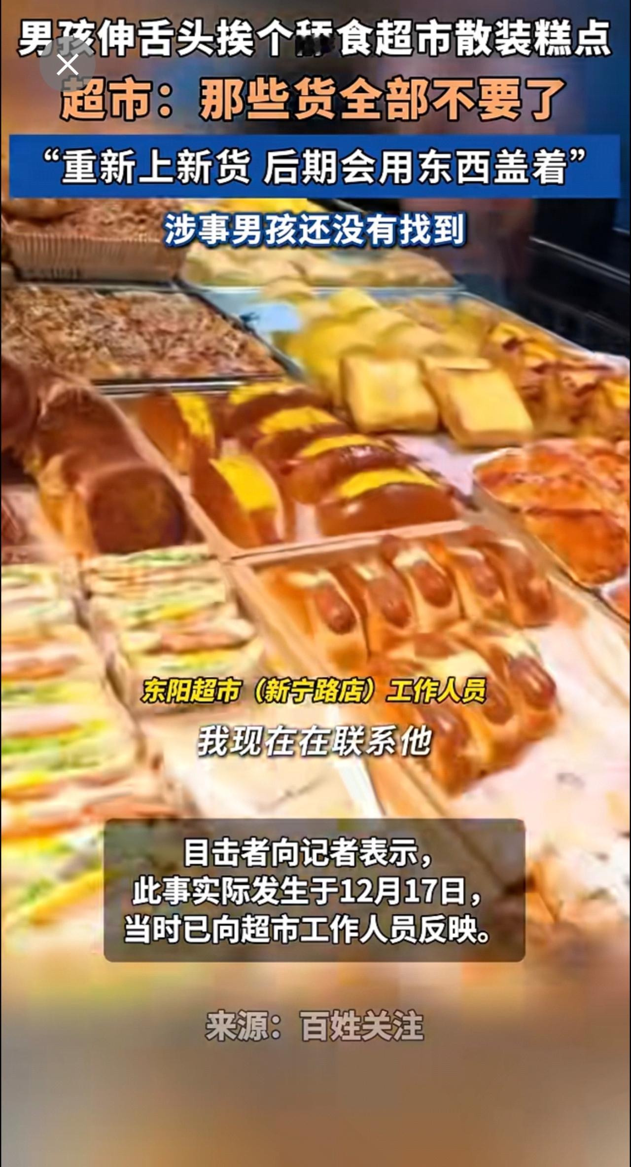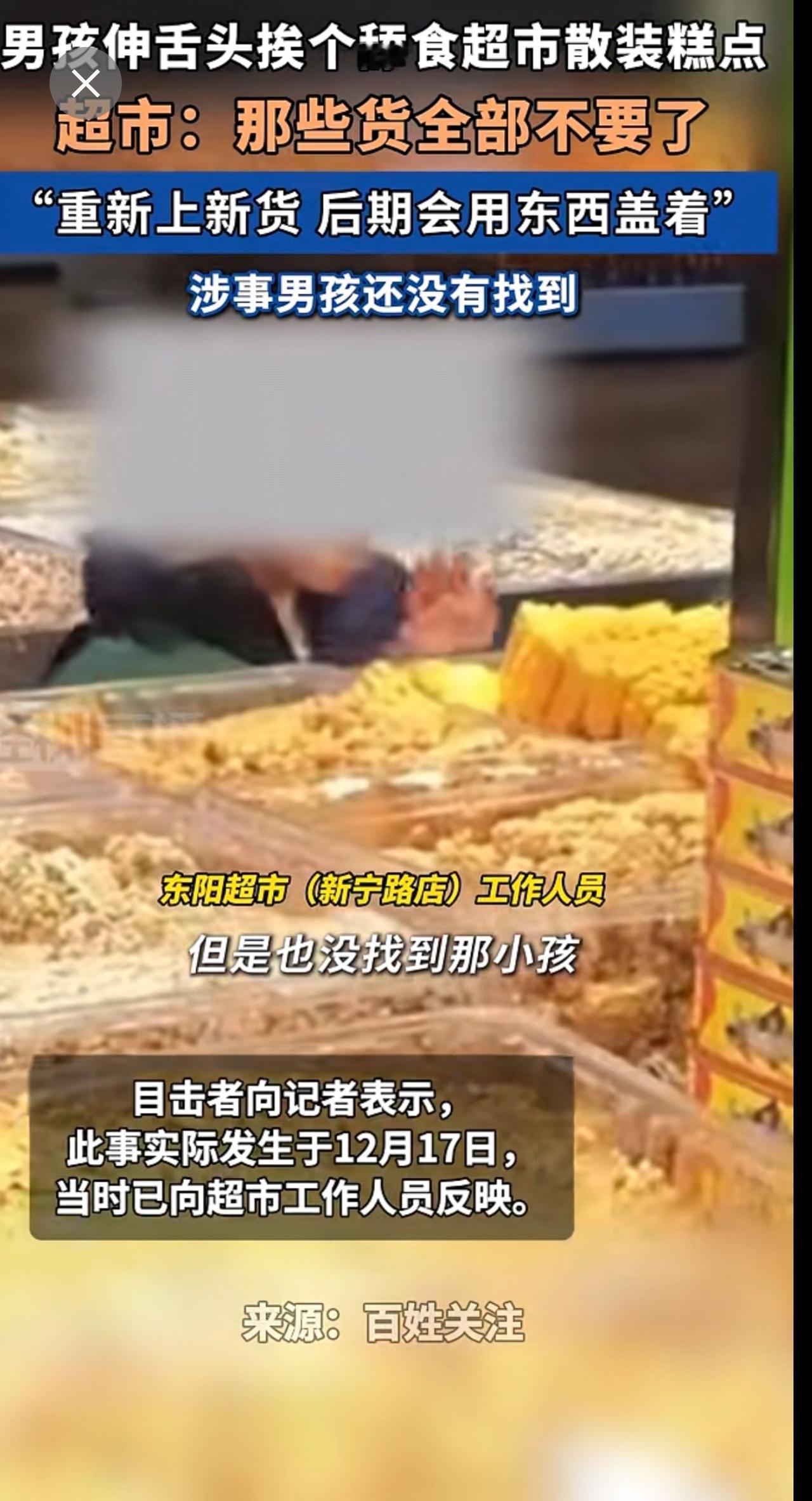 男孩伸舌头挨个舔食超市散装糕点,超市:“那些货全部不要了,重新上新货,后期会用东西盖着。”涉事男孩还没有找到。