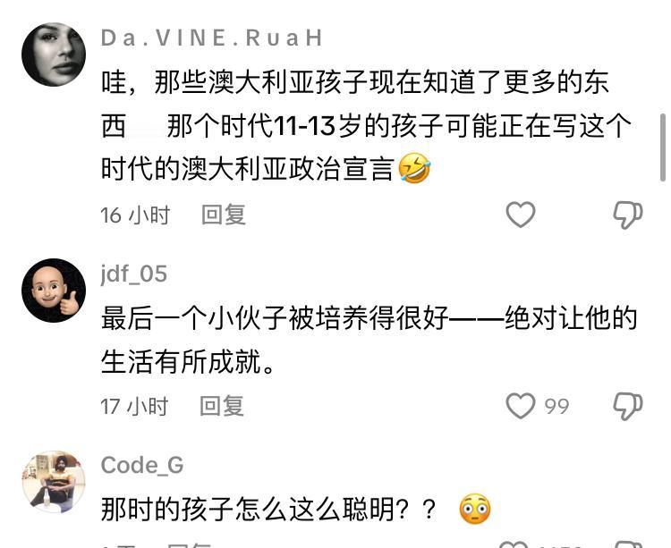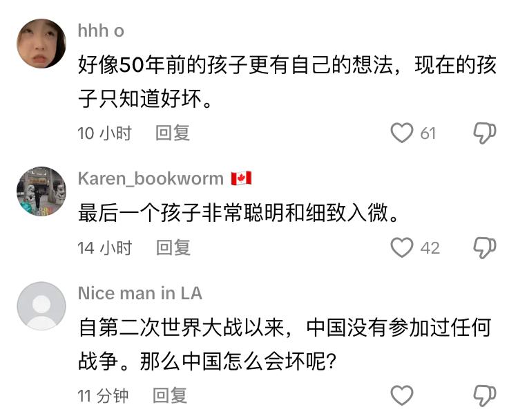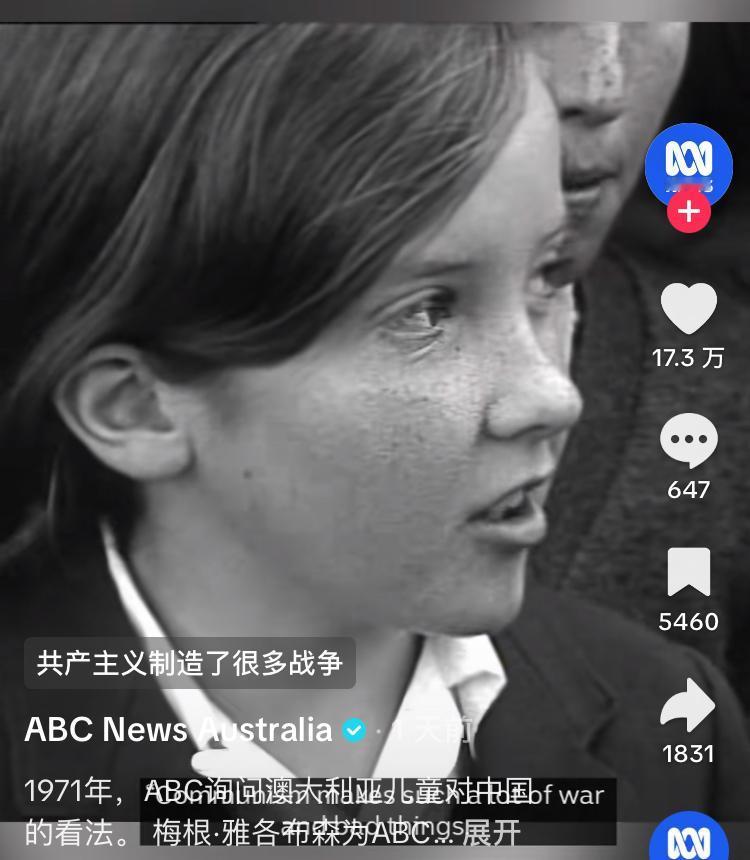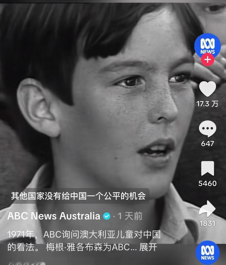 澳大利亚媒体放出1971年孩子们对中国的看法、 第一个孩子:姐姐的男朋友在中国居住,他说那边很拥挤 第二个孩子:共产主义制造了很多战争,如果这样的话我不会去那边 第三个孩子:我觉得媒体有问题,其他国家没有给中国一个公平的机会,报道的总是一面之词