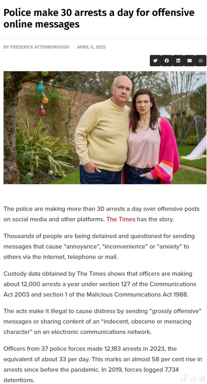 《泰晤士报》:英国警方因为“言论犯罪”每天逮捕超过30名在社交媒体和其他平台上发布帖子的人。《泰晤士报》获得的拘留数据显示,警方每年根据 2003 年《通信法》第 127 条和 1988 年《恶意通信法》第 1 条进行约 12,000 次逮捕。这些法案规定,通过电子通信网络发送“极其冒犯性”的信息或分享“不雅、淫秽或威胁性”的内容,造成他人痛苦属于违法行为。2023年,来自37个警队的警员共逮捕了12183人,相当于每天约33人。“闭嘴,我们在讨论言论自由”!