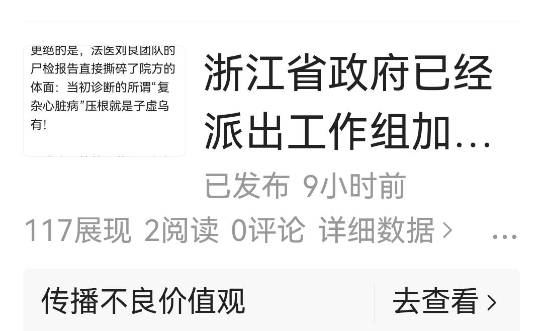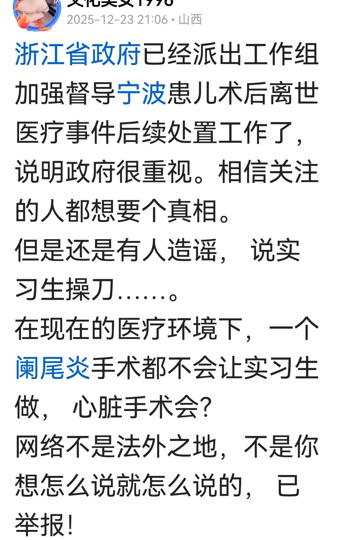 浙江省政府已经派出工作组加强督导宁波患儿术后离世医疗事件后续处置工作了, 说明政