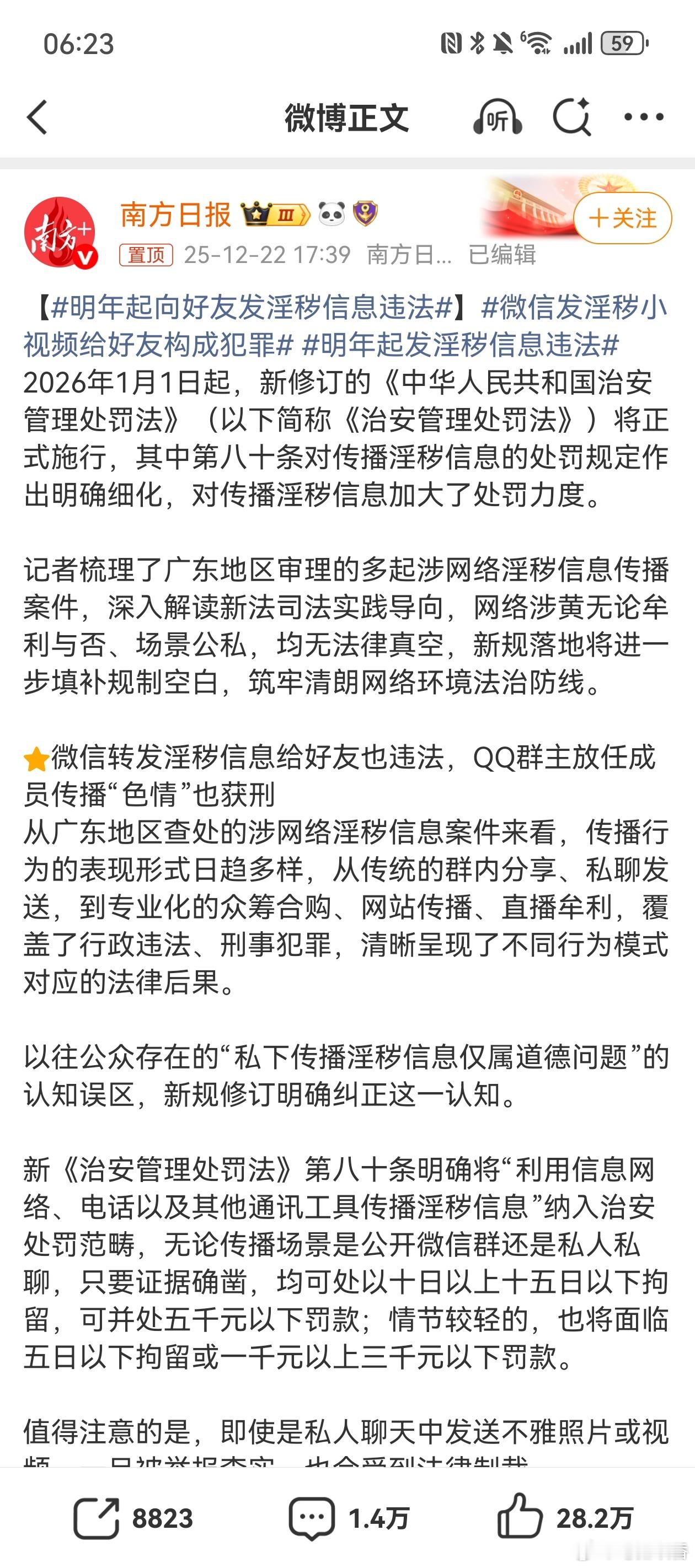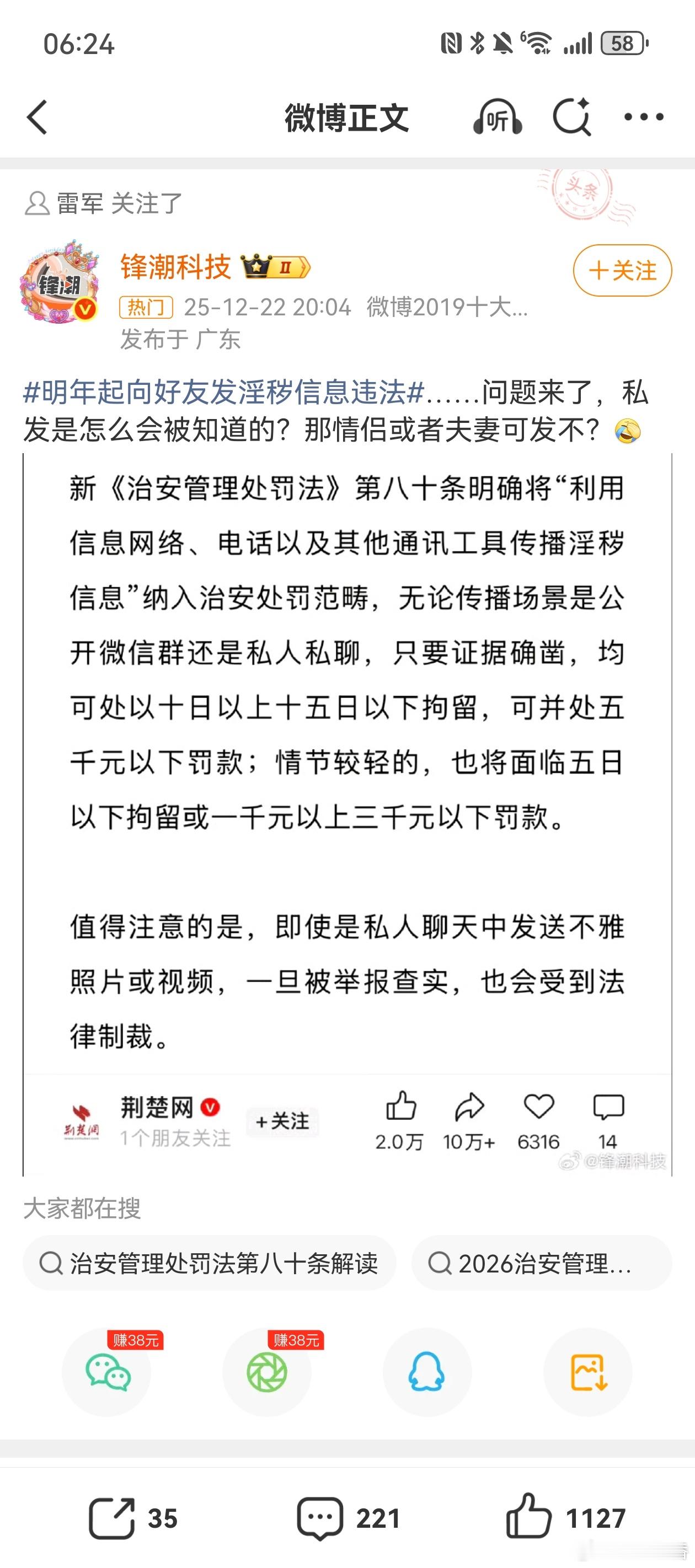 恶意解读何时休?相信大家看到大量某南方系媒体批量转发【】 这类文章,标题党+内容拼凑,对郭佳条款的修订进行恶意引导和解读,企图复刻“吸d封存条款”的热度,那事实真的如此吗?真如某系媒体说的“进行了细化和明确,私发也违法”吗?只要查查新旧对比不就知道了?原文我贴出来了,大家自己看: 【旧版】第六十八条,制作、运输、复制、出售、出租淫秽的书刊、图片、影片、音像制品等淫秽物品或者利用计算机信息网络、电话以及其他通讯工具传播淫秽信息的,处10日以上15日以下拘留,可以并处3000元以下罚款;情节较轻的,处5日以下拘留或者500元以下罚款。 【新版】第八十条,制作、运输、复制、出售、出租淫秽的书刊、图片、影片、音像制品等淫秽物品或者利用信息网络、电话以及其他通讯工具传播淫秽信息的,处十日以上十五日以下拘留,可以并处五千元以下罚款;情节较轻的,处五日以下拘留或者一千元以上三千元以下罚款。新旧在内容上有何区别??可以说某系就是在恶意引导,过分解读,利用大多数网友不会去核实这一点,为了制造流量挑起对立情绪,没有大体量媒体和传统媒体该有的社会责任感和新闻媒体底线!