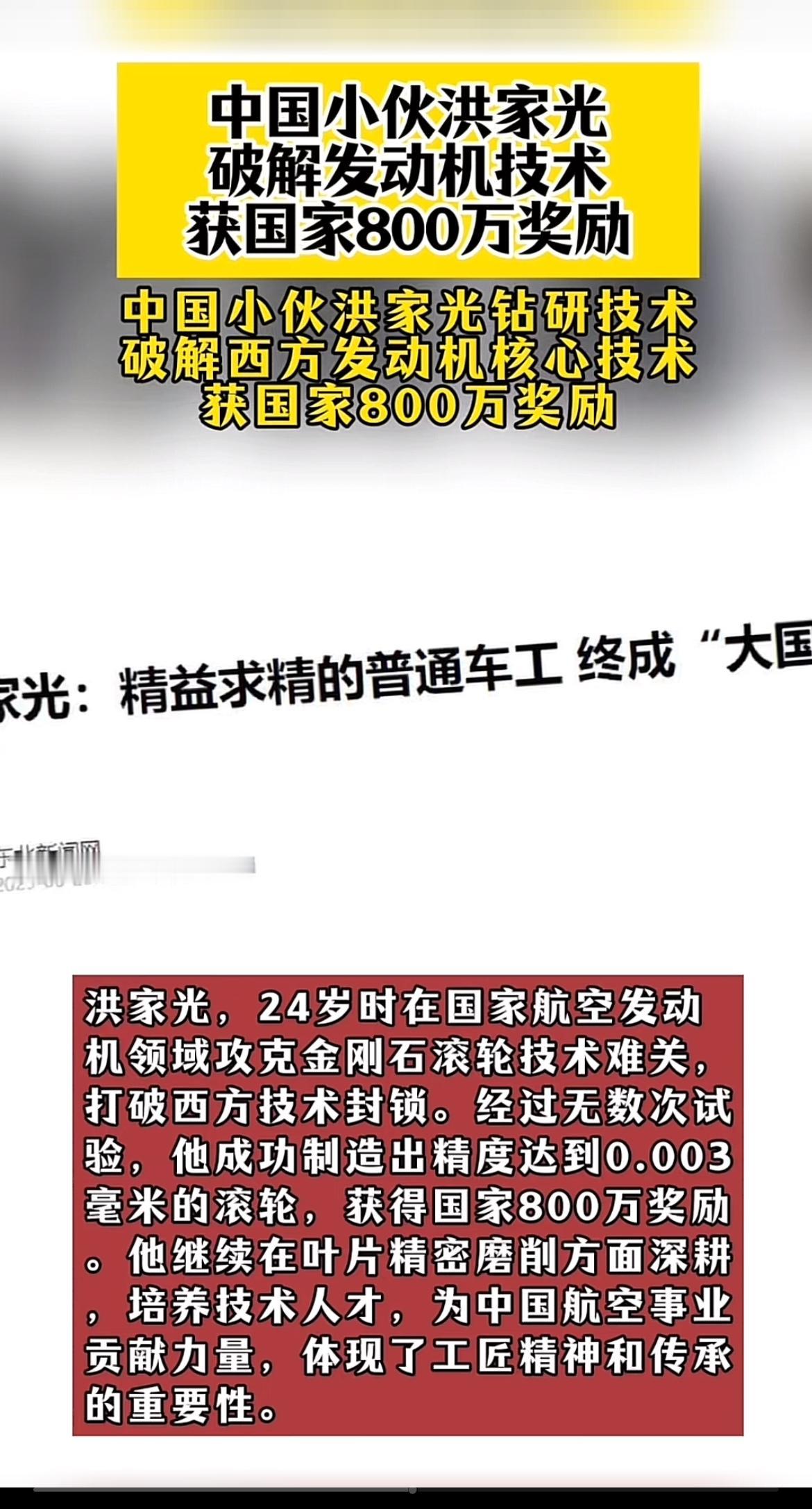 24岁小伙攻克航空发动机难题获国家800万奖励,这简直太牛了!这个小伙就是洪家光。2002年,沈阳黎明发动机厂被西方技术卡脖子,金刚石滚轮技术被锁,国内生产线废品率达85%。洪家光一个进厂才三年的技校生,站了出来。他在废料堆里翻检零件,用游标卡尺一次次丈量失败。某个凌晨,他闻到冷却液怪味,发现是0.1%的浓度偏差导致磨削温度失控。之后他自己折腾喷头,换管路、改角度、试流量,最终让精度达到0.002毫米。国家奖励他800万,他又全投回机床。他的故事太励志,为他点赞!