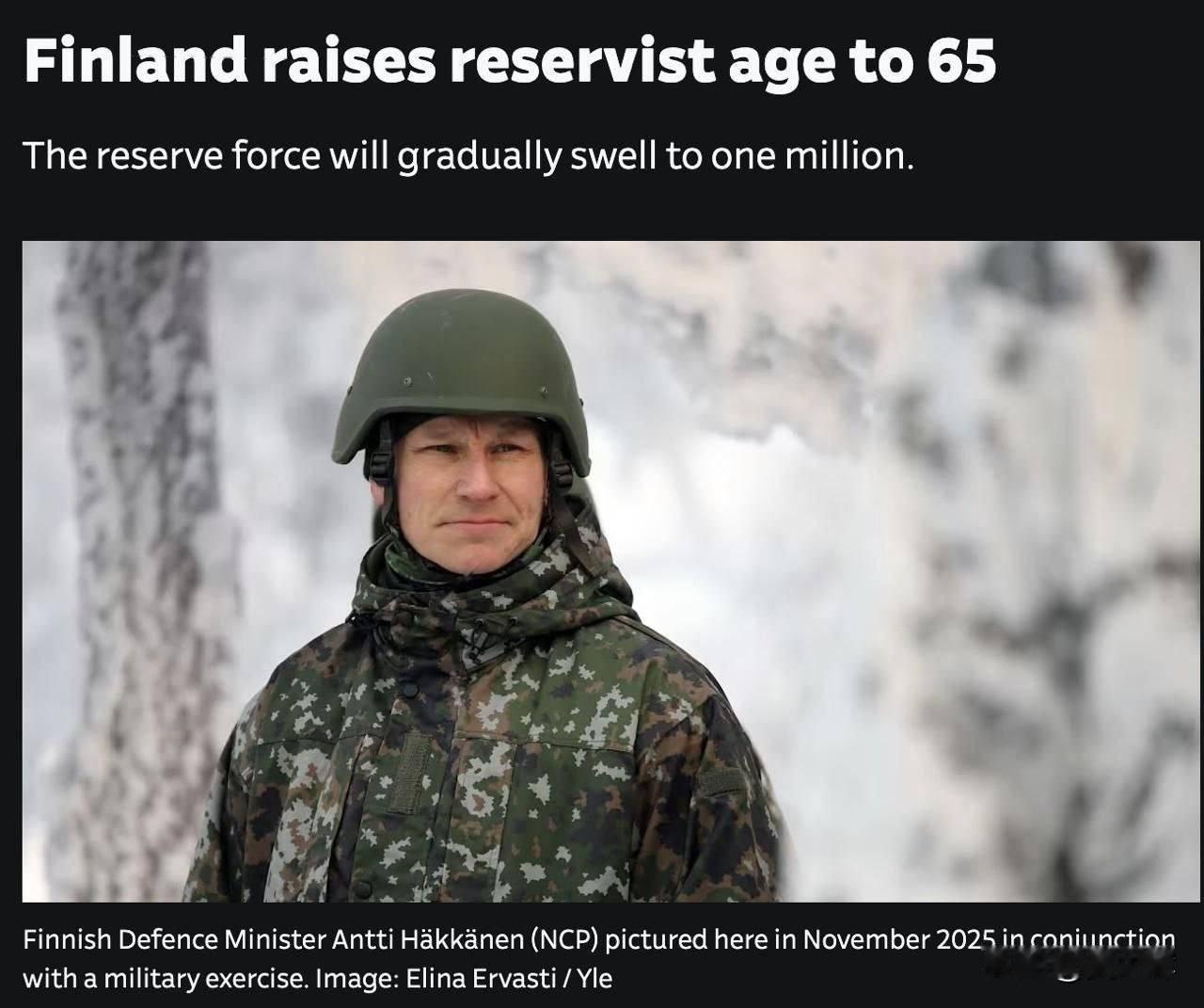 【芬兰扩大动员储备】芬兰将征兵年龄上限提高至65岁。新法律将逐步使储备人员数量增加约12.5万人。到2031年,芬兰计划将预备役总人数增至100万。当局解释称,这一决定旨在应对来自俄罗斯的可能威胁,从而加强国防能力。
