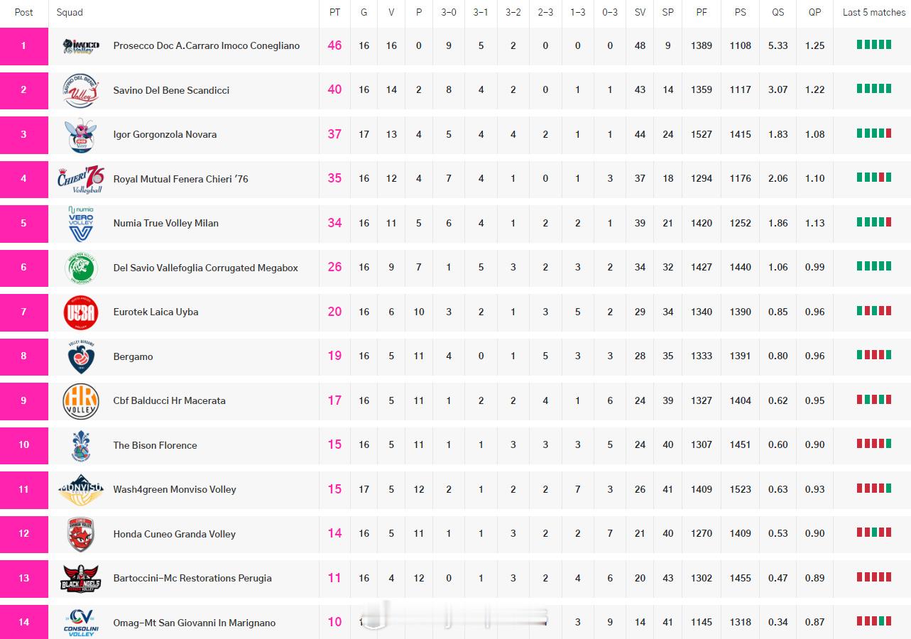 【意甲女排最新积分榜:米兰掉到第五 圣乔瓦尼继续垫底】朱婷12分单场MVP中国排球留洋动态 国际排坛动态12月23日,意甲女排第16轮结束,卫冕冠军科内利亚诺16连胜46分继续领跑,斯坎迪奇14胜2负40分位列次席,诺瓦拉多赛一场37分排名第三,基耶里和米兰分别以35分和34分暂列四五位;降级区皮内罗洛和贝尔加莫本轮均获胜取得宝贵三分,圣乔瓦尼和佩鲁贾成为难兄难弟排名倒数两位。