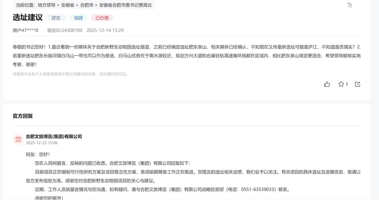 关于合肥野生动物园的选址,之前确定在肥东,现在传说在庐江,然后现在有人建议到长临河去。官方最新回复,没有透露。其实没必要搬,在大蜀山那还能让合肥市区多个景点,本身也没几个景点。