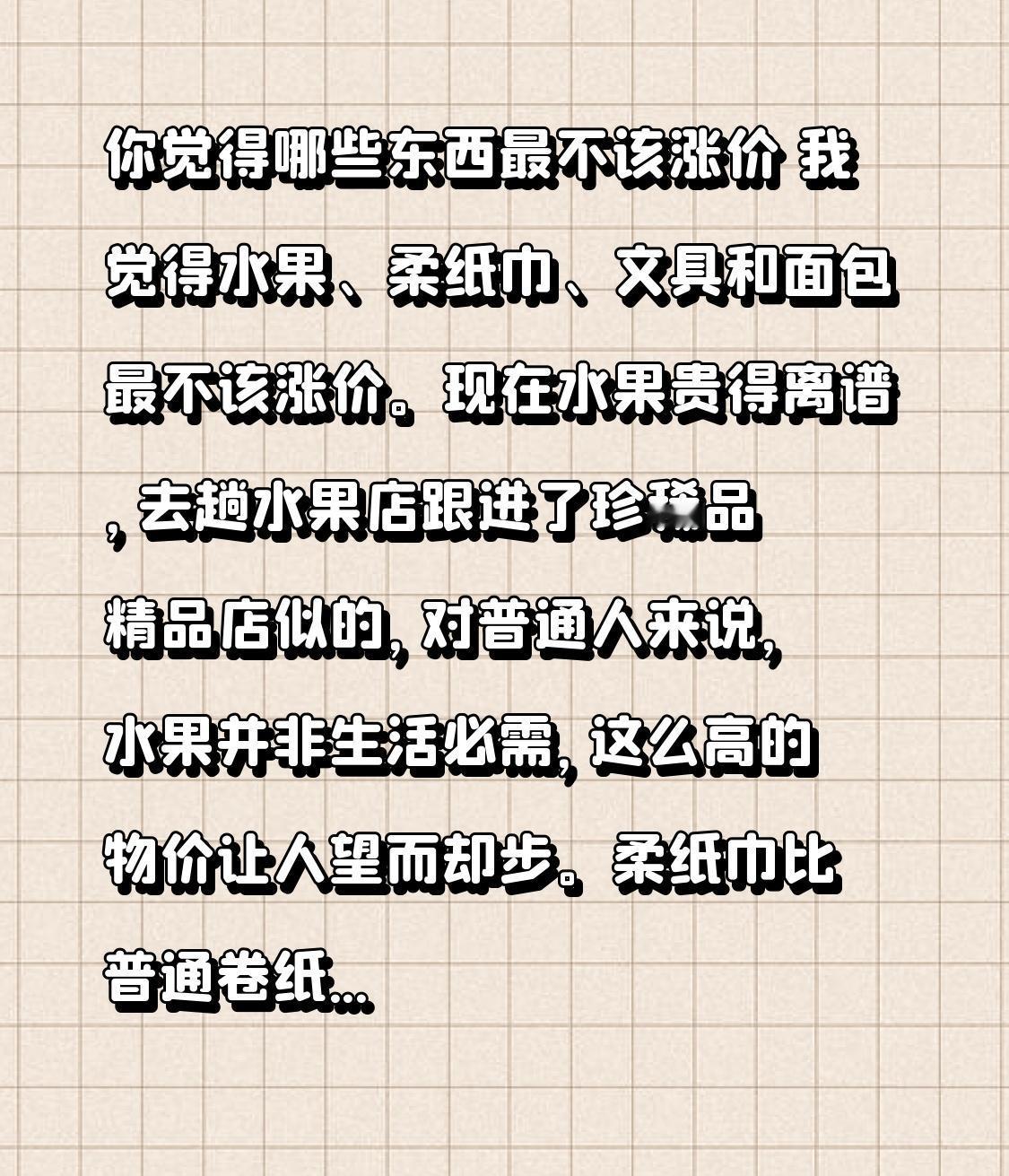 你觉得哪些东西最不该涨价 我觉得水果、柔纸巾、文具和面包最不该涨价。现在水果贵得离谱,去趟水果店跟进了珍稀品精品店似的,对普通人来说,水果并非生活必需,这么高的物价让人望而却步。柔纸巾比普通卷纸贵好几倍,其实日常用卷纸就够了。文具也贵得惊人,一支普通黑笔能卖到几十元,难怪都说孩子学习成本越来越高。面包也是,以前能当平价早餐,现在价格涨了不少。相比之下,一次性打火机、城区公交票、彩票、居民用电等价格多年稳定,这才是大家希望看到的。