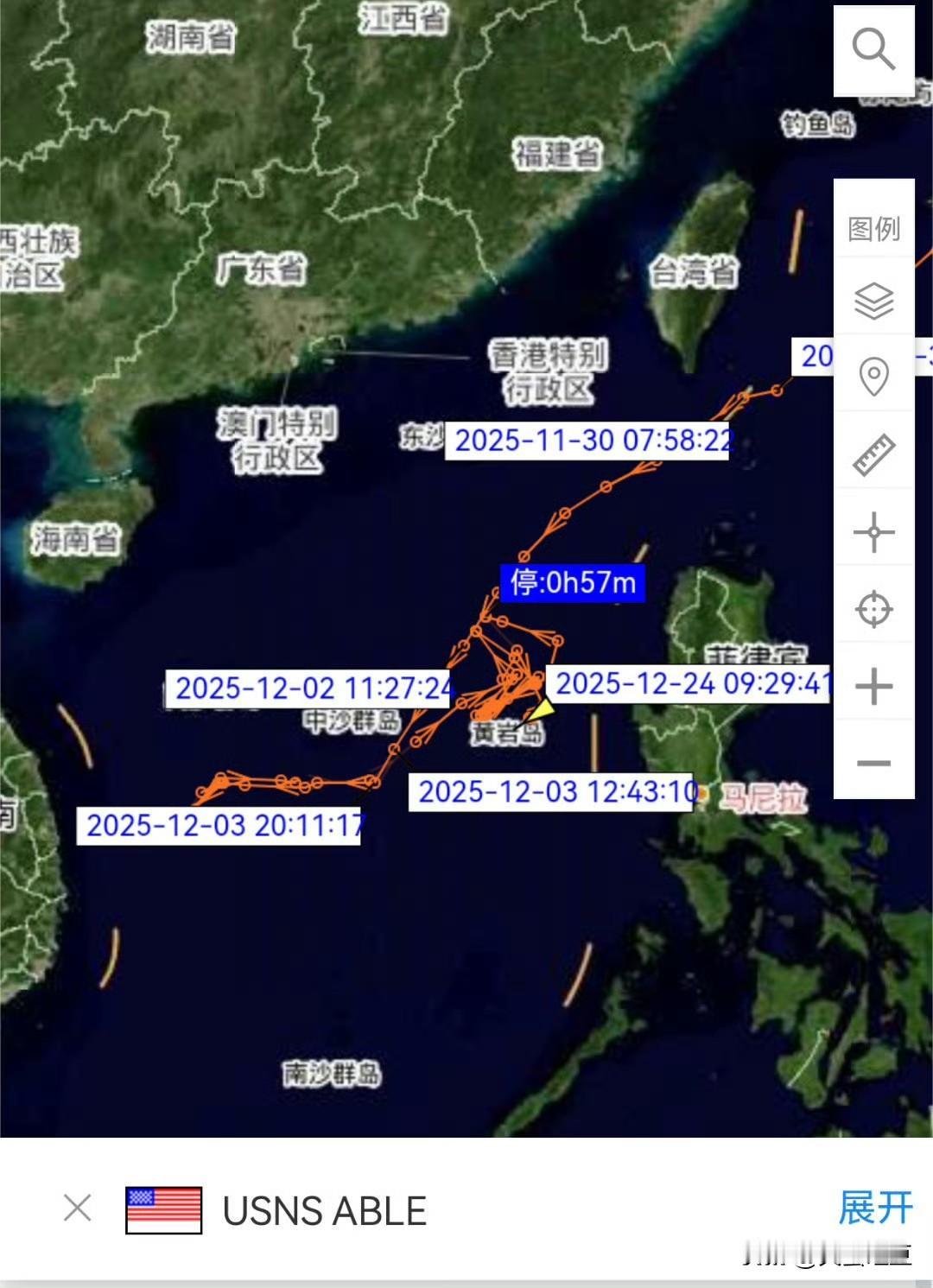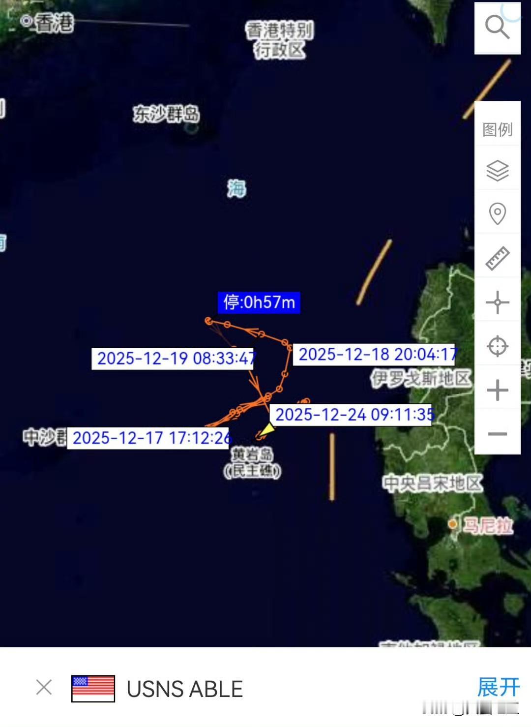 AIS信号显示,美国海军能干号海洋监测船(T-AGOS-20)持续位于黄岩岛以北海域进行侦察活动,距离黄岩岛最近约为85公里。无人船水下测量 海上监测