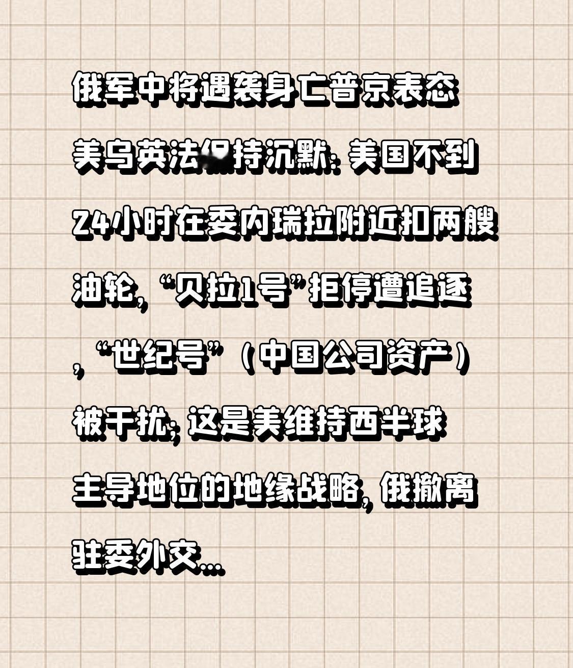 俄军中将遇袭身亡普京表态 美乌英法保持沉默:美国不到24小时在委内瑞拉附近扣两艘油轮,“贝拉1号”拒停遭追逐,“世纪号”(中国公司资产)被干扰;这是美维持西半球主导地位的地缘战略,俄撤离驻委外交官家属,战争风险上升;中国企业利益受损,国际金价飙升,全球贸易秩序受忧。