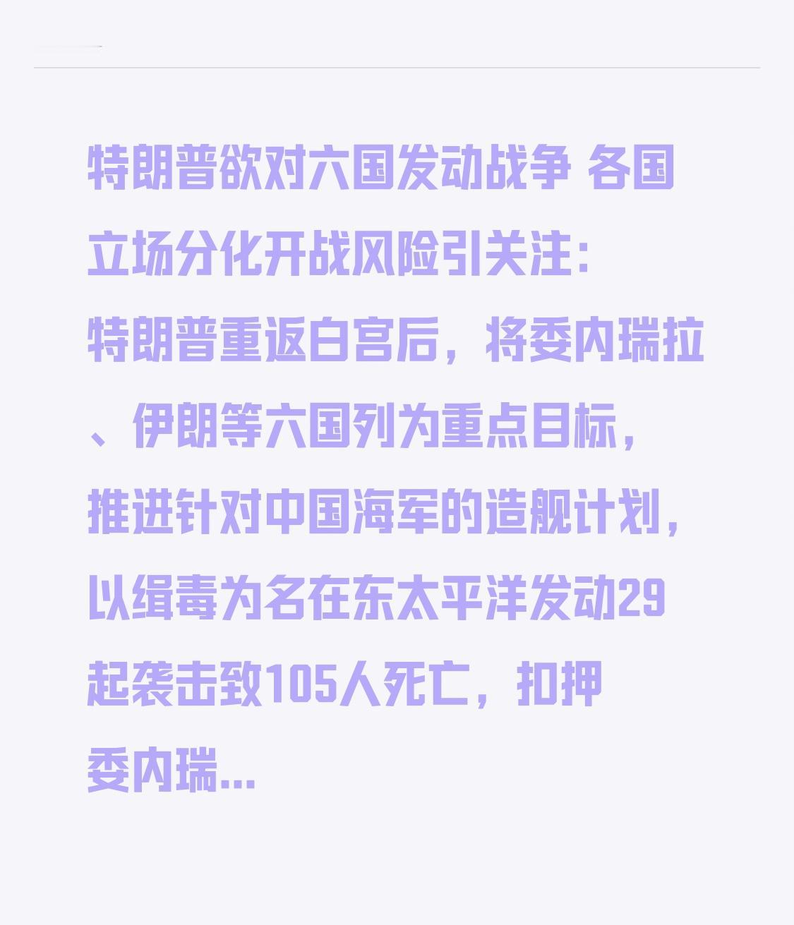 特朗普欲对六国发动战争 各国立场分化开战风险引关注:特朗普重返白宫后,将委内瑞拉、伊朗等六国列为重点目标,推进针对中国海军的造舰计划,以缉毒为名在东太平洋发动29起袭击致105人死亡,扣押委内瑞拉油轮欲占石油;中俄等支持委内瑞拉,各国立场分化,开战风险引关注。