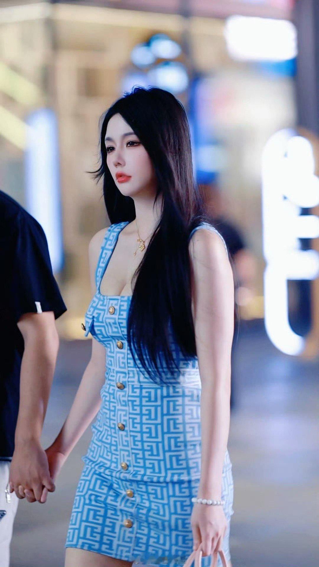 夜晚街头的温柔少女,白裙飘飘,宛如梦幻街拍高清美女