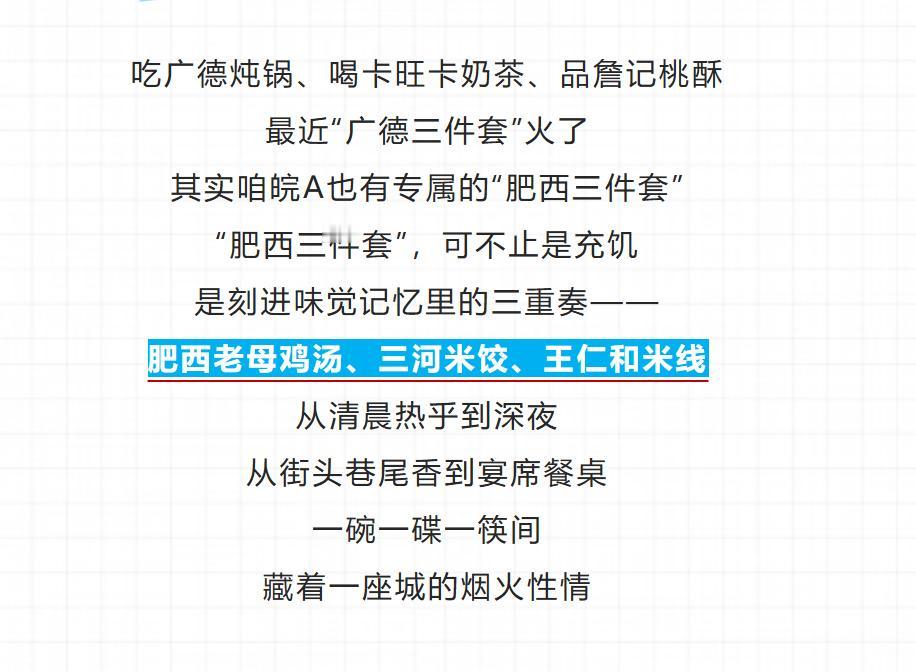 广德三件套很火,带来几百万的人消费,肥西之前也弄了个肥西三件套,可惜没啥动静。 这个里面主要的原因,广德那边是跟浙江非常近,都是那边来的人。合肥这边年轻人的消费力有限,基本都是在买房卖房,还房贷的路上。