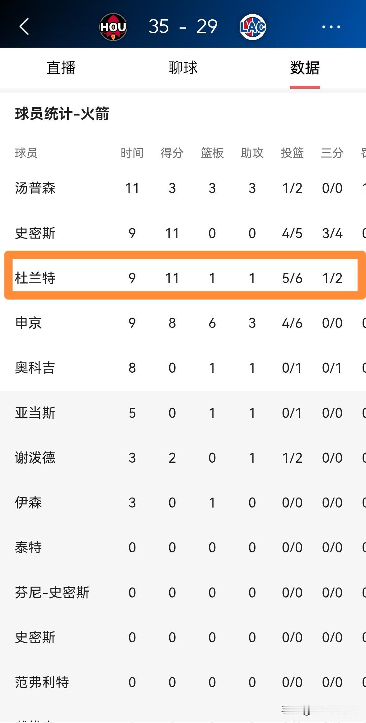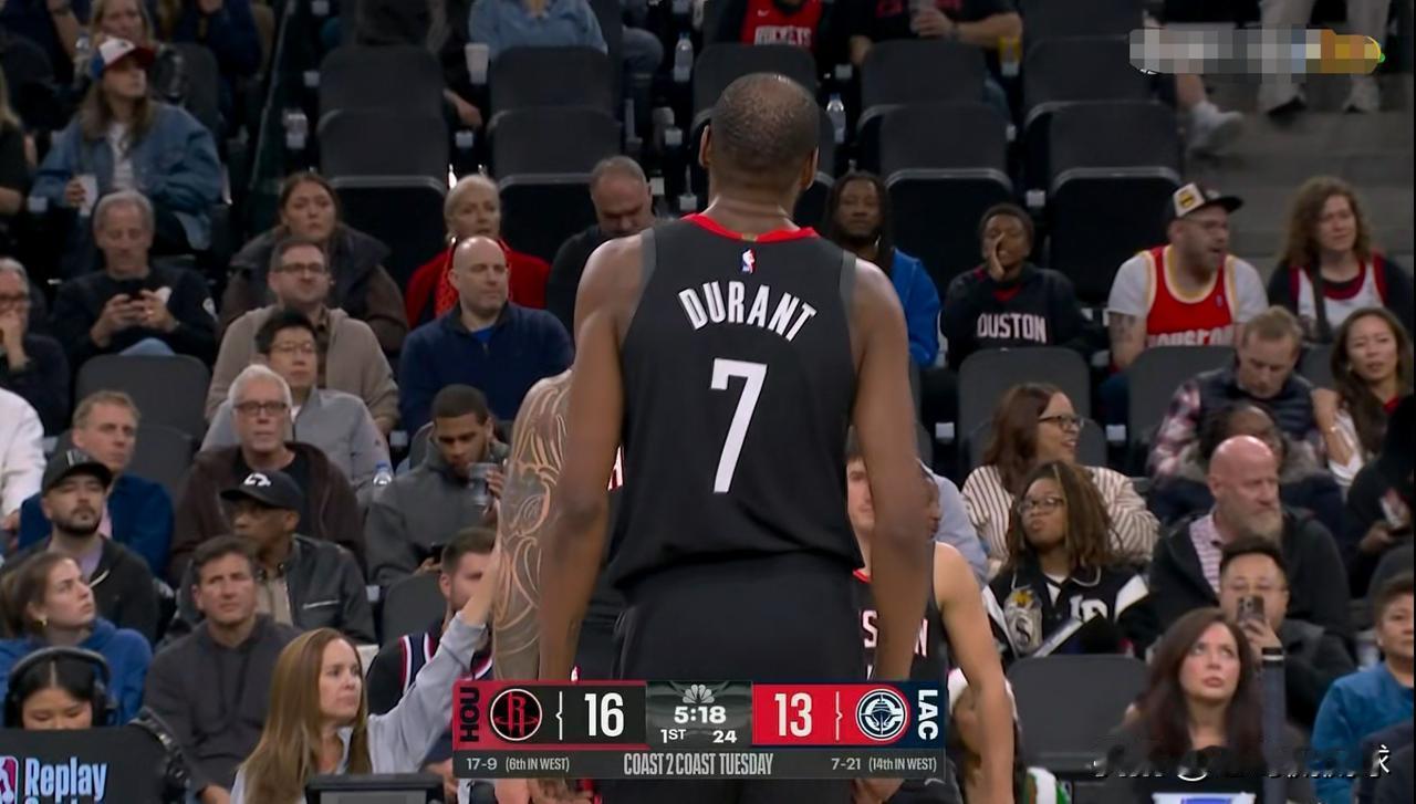 火箭超级巨星杜兰特真是太随心所欲了!在今天火箭客场挑战快船的首节比赛中,杜兰特首发出战9分钟,投篮6中5,其中三分球2中1轻松砍下11分1篮板1助攻,没有出现任何的失误。毫不夸张的说,对于杜兰特而言,快船的防守真是形同虚设,杜兰特想投篮就投篮、想突破就突破,他可以随心所欲的得分。