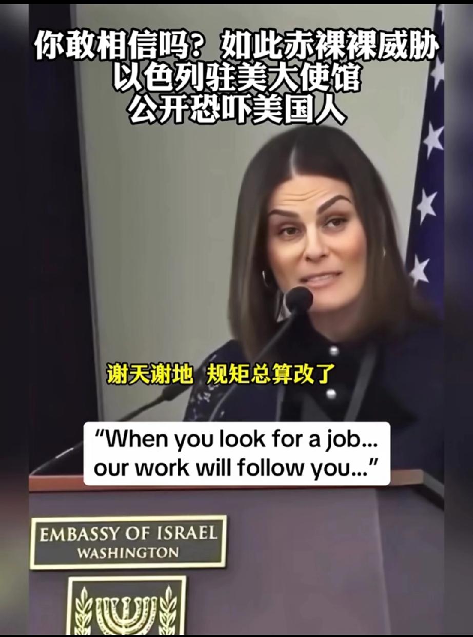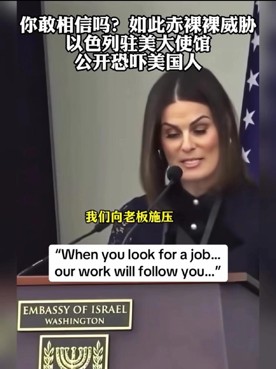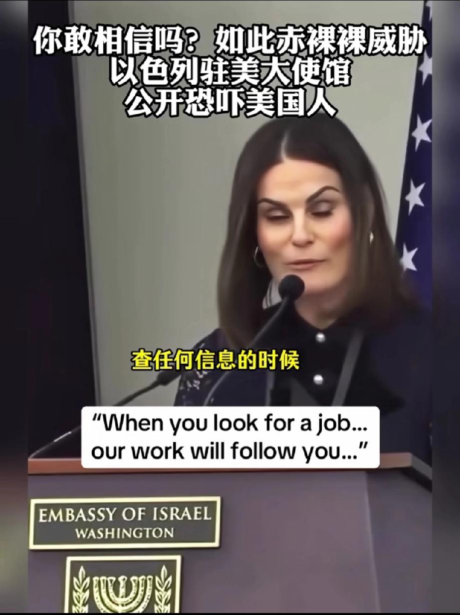 如果你是美国人,听到以色列驻美国大使馆下面这段话会作何感想? “我们会用聚光灯监视你,靠谷歌和搜索算法的能耐,监控灯如影随形会跟你一辈子,当你找工作的时候,当你找对象的时候,当你找保姆的时候,查任何信息的时候,你们做的事情会像白纸黑字一样留在网上,那些帮着骂以色列,给哈马斯洗白的高管,我们向老板施压,有人已经自己滚蛋了,有的被直接开除了,谢天谢地,规则已经改写了!” 就问你吓不吓人吧?在美国,敢反对你爹,会让你直接社会性死亡!