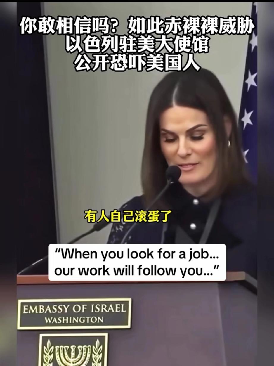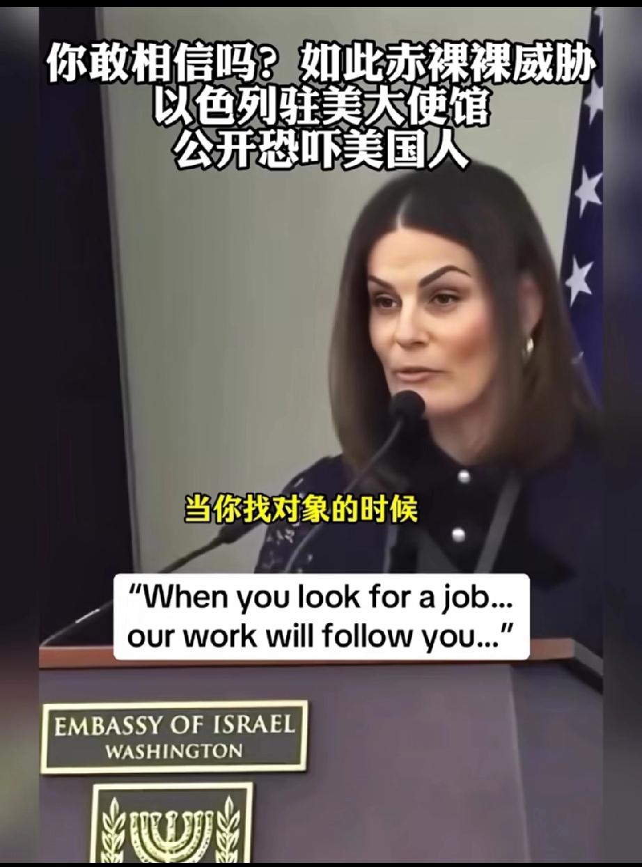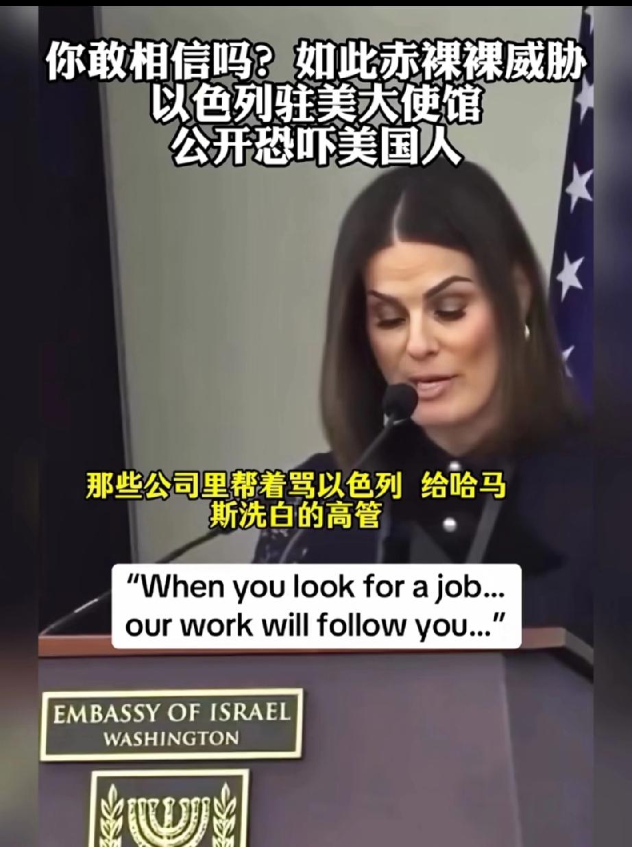 如果你是美国人,听到以色列驻美国大使馆下面这段话会作何感想? “我们会用聚光灯监视你,靠谷歌和搜索算法的能耐,监控灯如影随形会跟你一辈子,当你找工作的时候,当你找对象的时候,当你找保姆的时候,查任何信息的时候,你们做的事情会像白纸黑字一样留在网上,那些帮着骂以色列,给哈马斯洗白的高管,我们向老板施压,有人已经自己滚蛋了,有的被直接开除了,谢天谢地,规则已经改写了!” 就问你吓不吓人吧?在美国,敢反对你爹,会让你直接社会性死亡!
