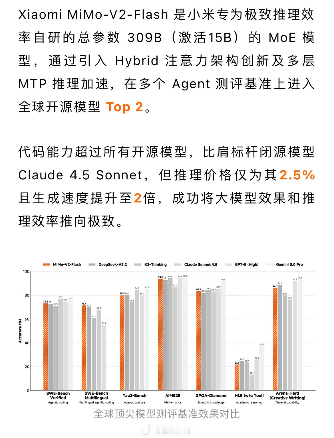 小米mimo多个agent测评全球开源模型排名前2,代码能力超过所有开源模型,比肩标杆闭源模型claude 4.5 Sonnet,但推理价格仅为其2.5%且生成速度提升至2倍,成功将大模型效果和推理效率推向极致。