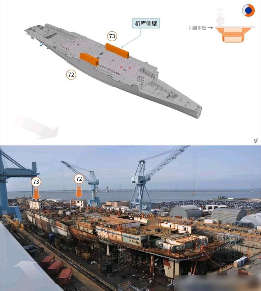 机库侧壁安装完成,水线都没接完就开始上机库了。最近看北方船厂的4号舰建造进度,真