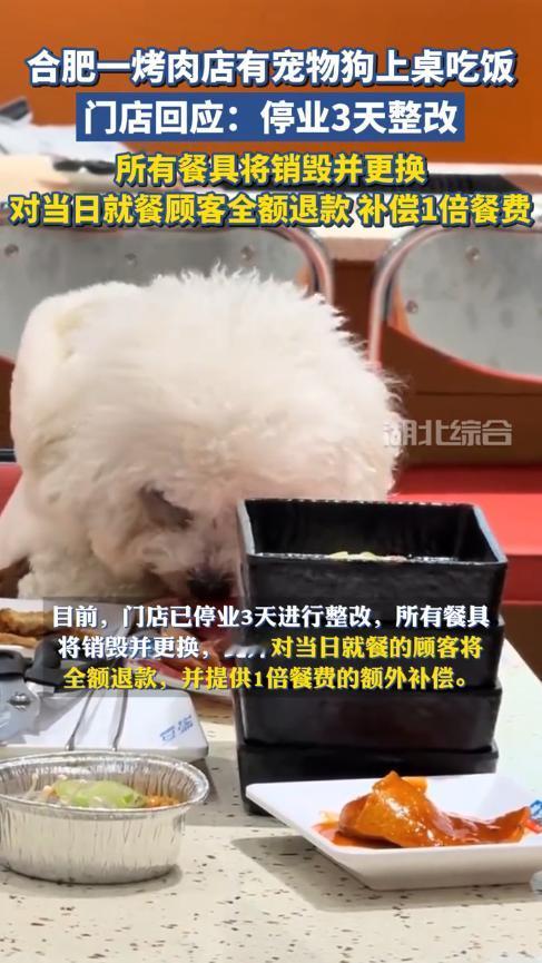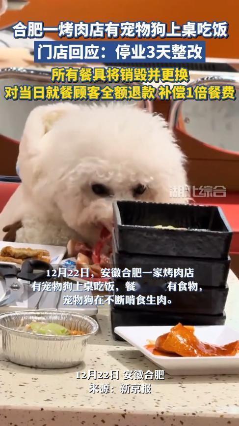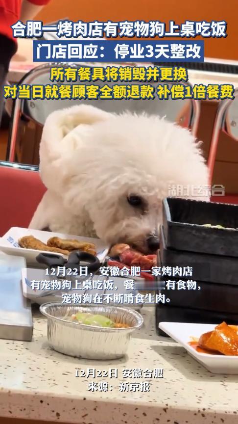 “必须严惩!”12月22日,安徽合肥,一女子吃烤肉时,发现邻桌空无一人,却有条狗在桌子上吃饭,小狗不断啃食着碗里的生肉,唾液飞得到处都是!看到这一幕,女子瞬间没有了食欲。网友:真当儿子养了? 现在年轻人都很喜欢养宠物,不少人更是和宠物同吃同睡,完全当做“儿子”在养,可是宠物身上却藏着很多细菌、寄生虫,虽然对于动物来说并没有危害,但却会对人体造成损害。 当天晚上,一女子和朋友逛商场时,觉得有些饿了,就选了一家刚开业不久的烤肉店吃饭,几人落座后不久,服务员就将菜品端了上来。 就在女子和朋友正吃得开心时,她竟看到旁边的桌子上有条白色的小狗,由于主人不在一边,小狗肆无忌惮的站在桌子上吃着盘子里的生肉! 这一幕立即引起了女子的反感,她认为这是人吃饭的地方,把狗带进来已经很过分了,更何况还让狗和人吃一样的东西! 女子将这个过程拍了下来并发到网上,立即就引起了网友们的激烈讨论,有人指责狗主人没有道德,有人指责店家疏于管理。 商家发现后也立即做出回应,当晚就关闭了店铺,给前来用餐的顾客退了款并额外补偿,同时还将店内的餐具全部更换,对店内进行仔细地消杀。 当然,这件事不能全怪商家,狗主人有着更大的责任,如果能约束好自己的狗,就不会发生这种恶心的事! 信息来源:《合肥一烤肉店回应宠物狗上桌吃饭:停业3天整改,所有餐具将销毁并更换》大众新闻-大众日报