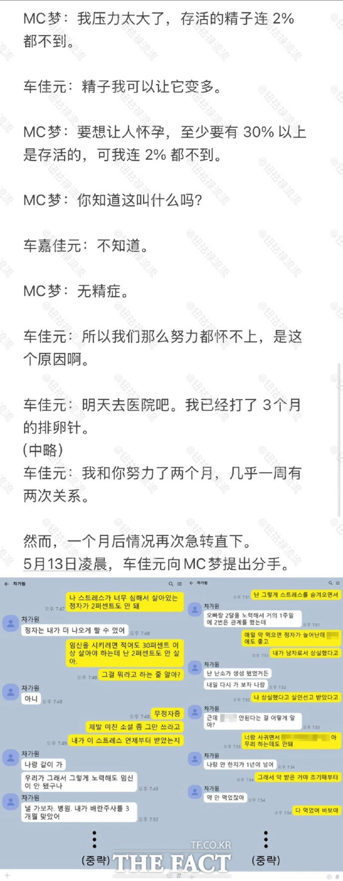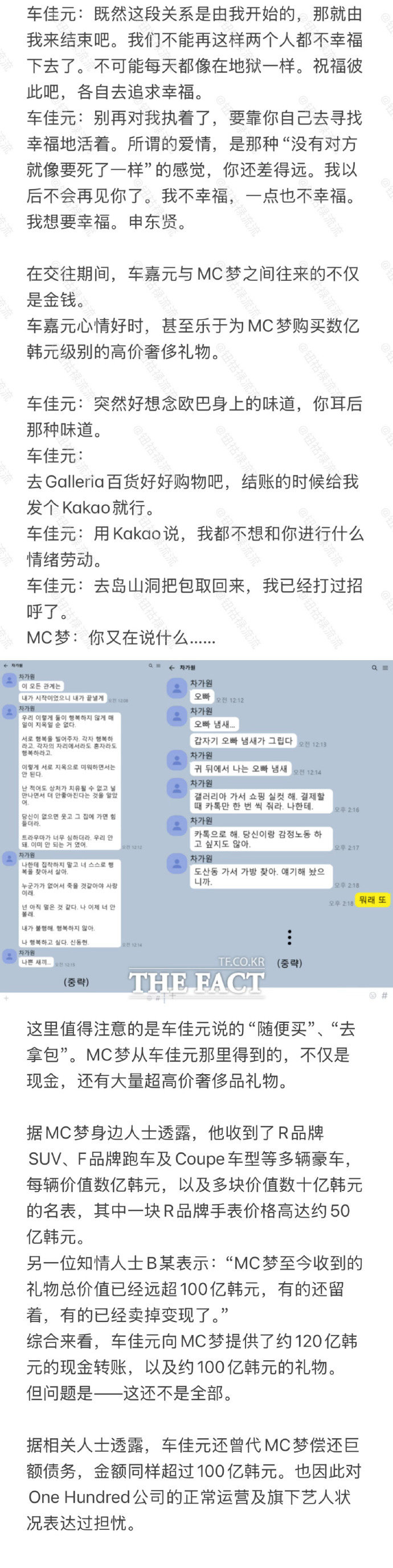 MC梦与公司代表不伦恋MC梦有无精症 韩剧走进现实!据韩媒,MC梦被曝与有家室的公司代表车佳元不伦恋。此前,车佳元曾起诉MC梦,要求其归还120亿韩元(约合5784万元人民币)欠款。媒体调查发现“巨额欠款”的背后是两人爱恨的纠缠,据调查他们的金钱关系从2022年7月开始,之后给车佳元MC梦多次转账数额达到120亿韩元,知情人士还称车佳元经常给MC梦买礼物,数额超过了100亿韩元(约合4830万人民币),此外,车佳元还会给MC梦偿还别的债务,这笔钱也超过了100亿韩元。媒体还公开了两人的聊天记录,两人在4月时还商量着要孩子,但MC梦却说:“想要怀孕的话,精子至少有30%是存活的,我2%都不到”,“这叫无精症。”(文字翻译cr钮祜禄流流)