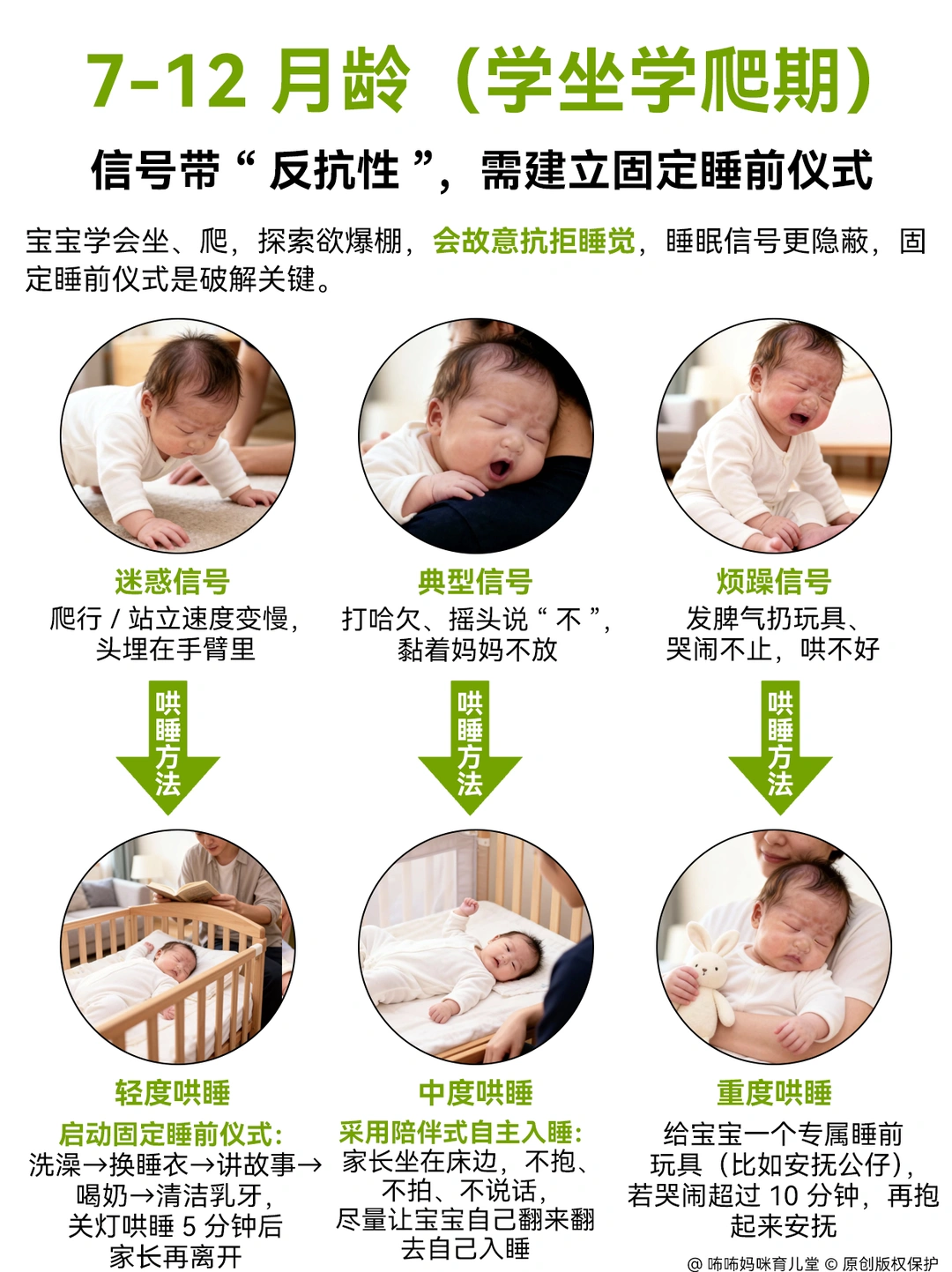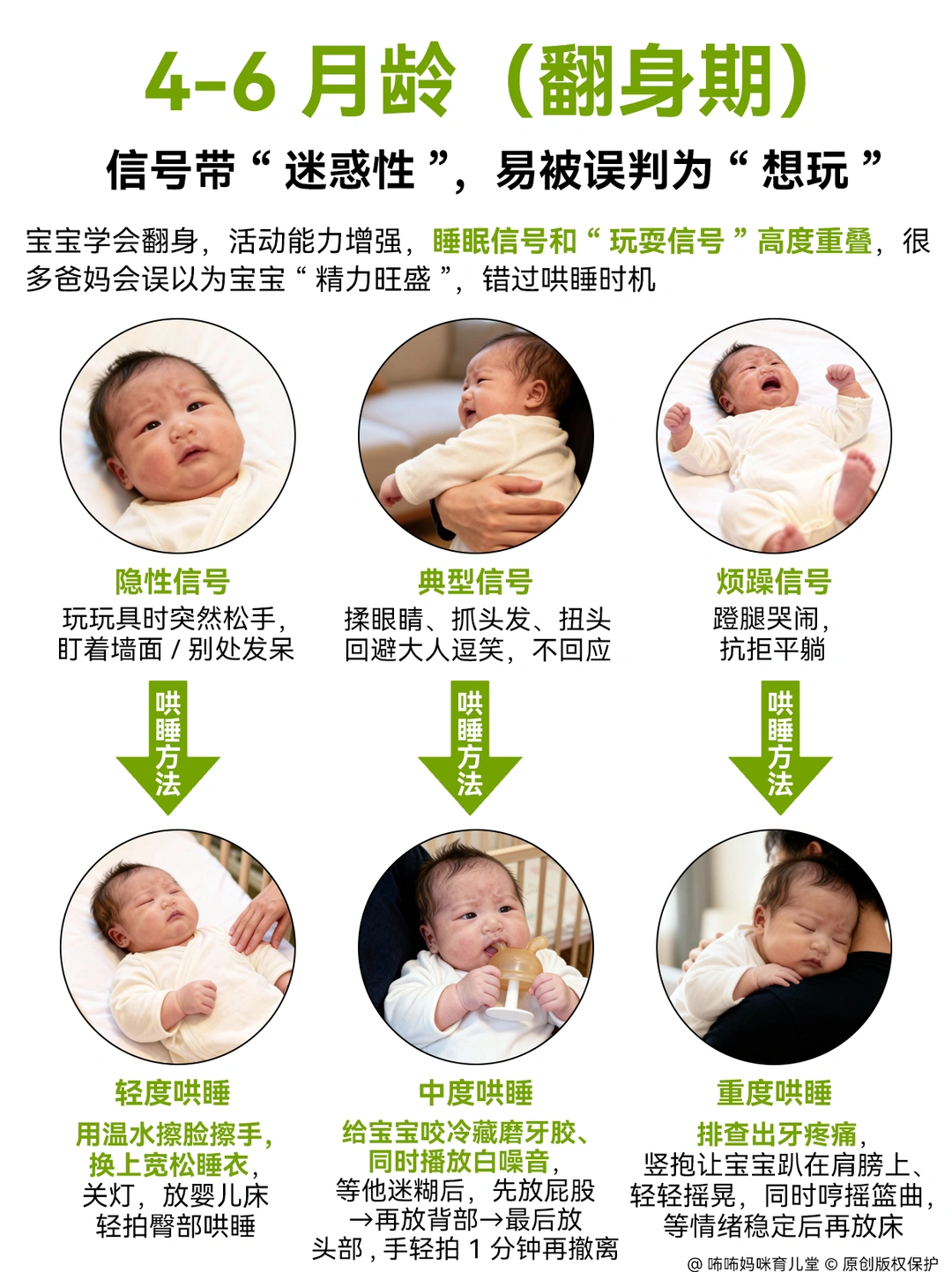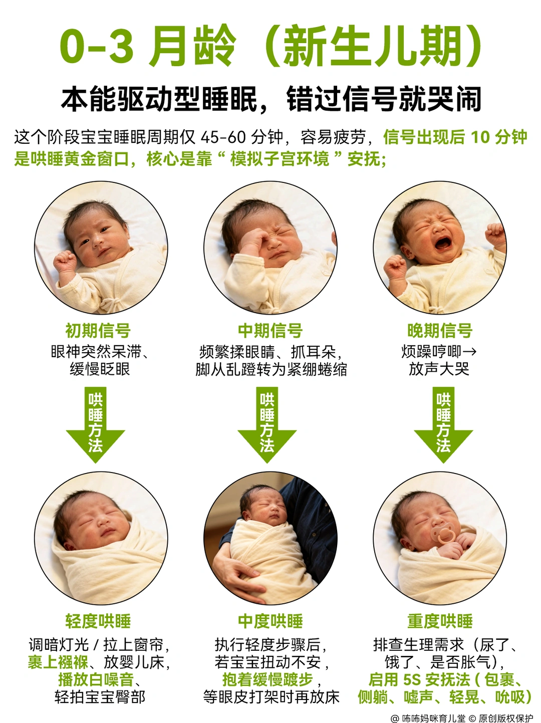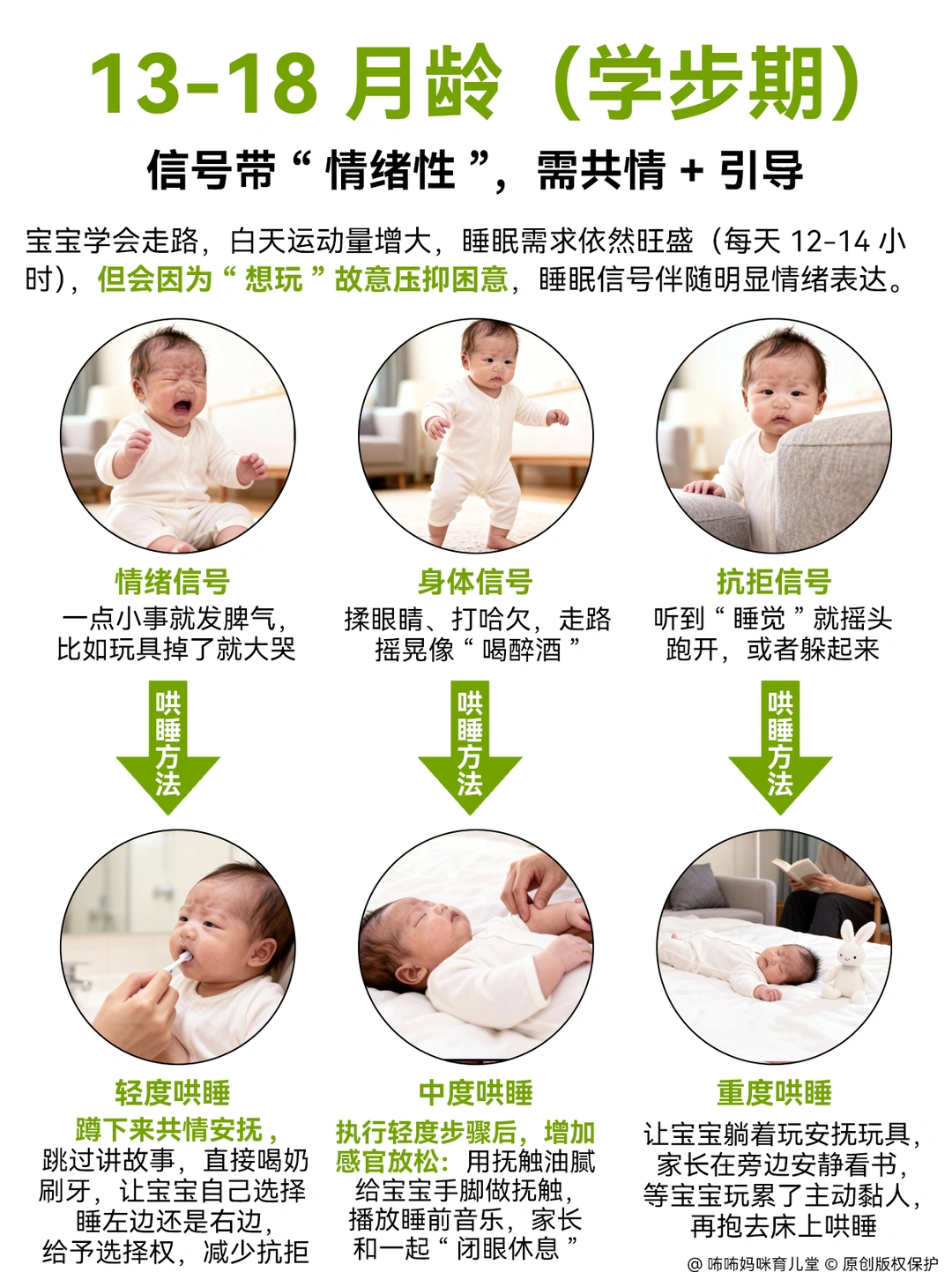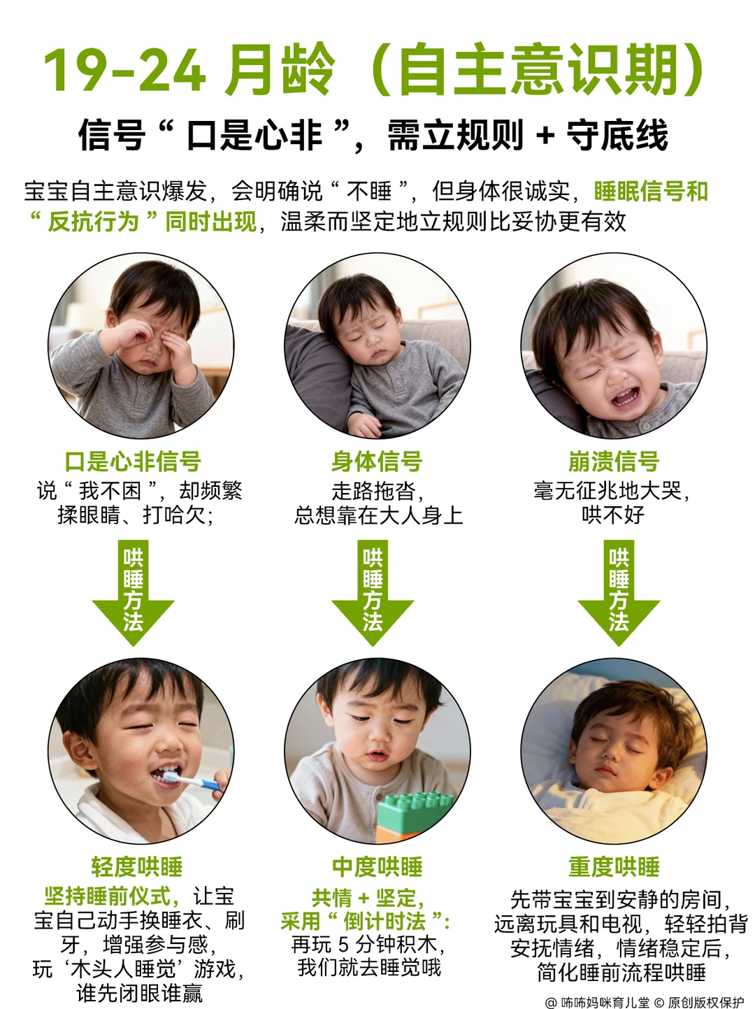 0在没有摸清宝宝睡眠信号前, 我也觉得宝宝哄睡太累了😭 在经过看了很多哄睡方法,加上亲身实践,发现抓准信号哄睡,根本不用硬扛! 每个月龄信号和方法都不同,大白话总结如下,照做就行。 . 1️⃣0-3个月新生儿: 极易疲劳,10分钟内是哄睡黄金期。信号:初期眼神发直、不追视、轻打哈欠; 中期频繁揉眼、手脚绷紧蜷曲;晚期直接哭闹(过度疲劳)。 轻度:抱去安静暗房,裹襁褓防惊跳,开白噪音拍嗝后放床,哼摇篮曲即可。 中度:加心跳节奏拍屁股,轻晃至迷糊再放床,惊醒轻拍接觉。 重度:先查尿布、饥饿、胀气(胀气做蹬自行车动作),用裹抱、侧躺、嘘声、轻晃、吮吸5法安抚,哭停必放床,杜绝抱睡。 . 2️⃣4-6个月翻身期 信号易误判为想玩。 表现:玩玩具突松手发呆、使劲咬奶嘴;揉眼、拒逗不笑 轻度:收玩具,温水擦脸换睡衣,开小夜灯陪在旁。 中度:先给冷藏磨牙胶缓出牙不适,抱半躺靠床头,迷糊后按“屁股→背→头”顺序放下,轻拍1分钟撤离; 重度:按摩牙龈缓疼痛,竖抱拍背哼歌,平静后放床,搭配带家长气味的安抚巾。 . 3️⃣7-12个月学坐爬期:故意抗拒睡觉,信号隐蔽。 表现:爬行慢易摔、突趴地不动;打哈欠拒睡、黏妈不放;闹凶时扔玩具大哭。 轻度:按固定流程(洗澡→换衣→讲故事→喝奶→刷牙)操作,全程20分钟,关灯陪5分钟再离开。 中度:坐床边不抱不拍,让宝宝自主翻身入睡,哭时轻握小手安抚。 重度:先做5分钟安静运动,用专属睡前玩具转移注意力;哭超10分钟再安抚。 . 4️⃣13-18个月学步期:困了硬撑,信号带情绪。 表现:突黏人拽衣角、小事哭闹;走路晃像醉酒;拒听“睡觉”指令。 轻度:蹲身共情,简化流程直接喝奶刷牙,让宝宝自主选睡姿。 中度:用抚触油按摩胳膊小腿,陪躺闭眼休息,轻声回应聊天并渐降音量。 重度:不强迫进卧室,等宝宝玩累黏人再抱床;半夜醒不开灯,用熟悉声音哄睡。 . 5️⃣19-24个月自主意识期:口是心非。 表现:说“不困”却揉眼打哈欠、走路爱倚靠、玩玩具易分心;累极突发崩溃哭。 轻度:游戏化引导(如木头人睡觉),让宝宝自主换衣刷牙,留安抚玩偶。 中度:共情后坚定立规则,用倒计时提醒,不妥协。 重度:抱去安静房间安抚,不批评;情绪稳后温水擦脸,简化流程陪睡,次日重申规则。 .