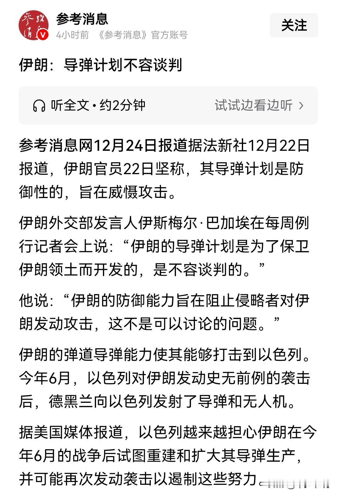伊朗如果能早点“支楞”起来也不至于成今天这个样子 伊朗称“伊朗导弹计划是为了保卫伊朗领土而开发的,是不容谈判的”,伊朗现在“支楞”起来是不是有点晚了。 曾经的伊朗拥有抵抗之弧和众多中东盟友,东方大国和俄罗斯也支持伊朗,但是伊朗自己觉得美国更可靠,所以献祭了抵抗之弧和中东的盟友们。 现在伊朗为了自保又想生产导弹来自保,而以色列和美国根本不会给伊朗这个机会。