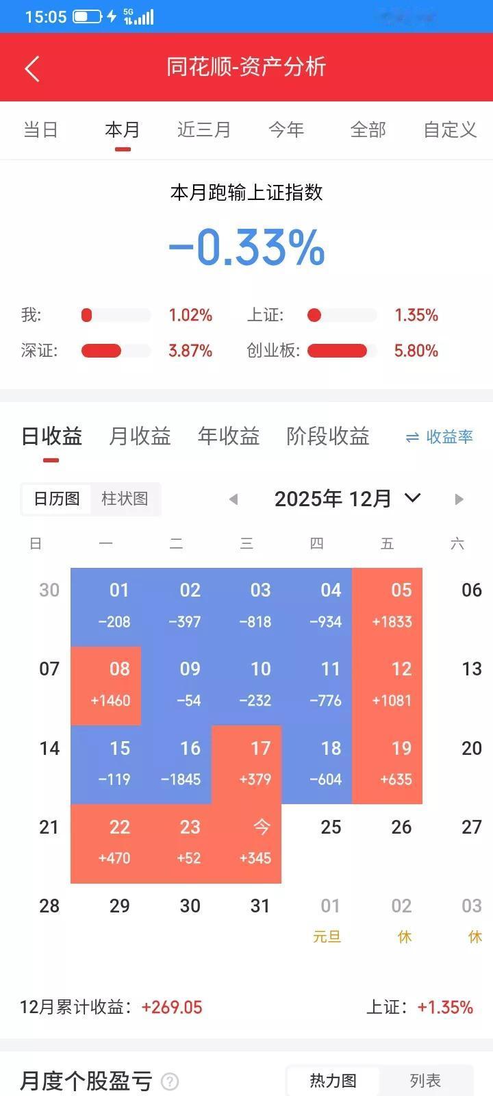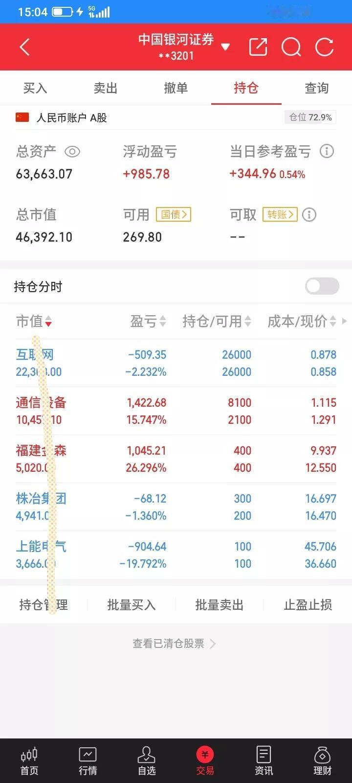 2025.12.24,今天上证指数又强势上涨,但是我持有3只股票,两只上涨一点点,一只下跌,两只etf,一涨一跌。重仓的下跌,抵消了上涨的利润。 今天金森低开,反弹上涨,前几天补仓的100,今天有一点点利润了,现在仓位太重了,不能太贪心了,见好就收吧,收盘以12.55卖掉100股,赚30块钱算了。 上能今天低开低走,但是胆小了,不敢补仓,又错过了一波上涨,但是今天最高冲到37元,然后又回落了,感觉上涨的阻力比较大了,愿赌服输,先止损100股吧,收盘以36.66卖掉前几天补仓的100股,留下100股继续死扛吧。这只股票还亏损900多。 重仓的港股通互联网etf今天继续下跌。但是下午港股过圣诞节了,互联网etf失去了参照物,就基本上不涨不跌,只能耐心等待了。 今天通信设备etf又强势上涨,上升趋势的股票,每一次回落都是好的买入时机,回头看看,每一条阴线都是好的买入时机。早上回落中以1.265买入6000股,还好,虽然没有买在最低价,但是方向是正确的,收盘以1.291卖掉2000股,卖在当天最高价,不断上涨,不断卖出,降低风险。 株冶高开,幻想会上涨,但是开盘价就是最高价,逐步下跌,又没有卖,错过了,但是没有大幅下跌,就继续持有,收盘以16.47补仓100股,赌一把明天反弹上涨吧 今天总市值4.63万元,总资产6.36万元,今天总体账户反弹回本344元,这个月账户又终于翻红了。