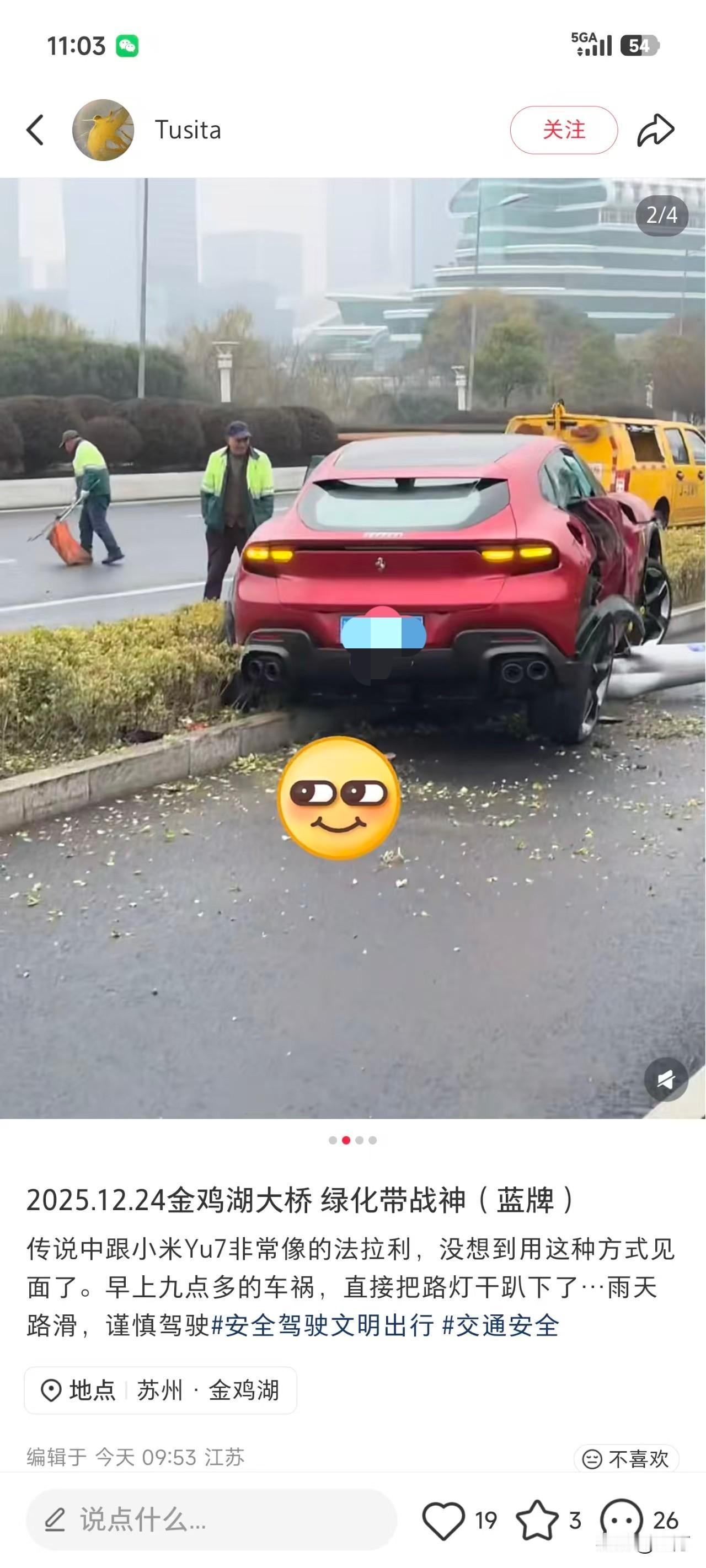 这是价值几百万的法拉利SUV。 就在今天,有朋友在社交网络发了两张照片,照片当中是一辆红色法拉利的SUV,骑到了绿化带上去时,他的右侧后车门中间应该是受到的撞击。 根据公开的信息来看,这个SUV是非常贵的,全部办起来好像要六百多七百万的样子,因为这个车和我们自主知识品牌的某一款车长得很像,所以很多人其实在老早就认识这个车了。 但是在马路上还是很少碰到这个车的,这个车的价格和劳斯莱斯库里南差不多了,目前不知道车主是什么原因造成的这起交通事故,可能是下雨天打滑,也有可能是其他的原因,而且他还撞到了电线杆子,不知道车主的情况怎么样。 估计保险公司看到这个情况有点头疼,毕竟这种车处理这种事儿,估计后续理赔起来不是一个一般的数字。 该说不说,这个车的造型看起来,是真的很流线型,再加上他又是法拉利这个品牌,而且目前他们唯一的款SUV就是这种型号的,所以正经上牌在路上跑得真的不是很多。