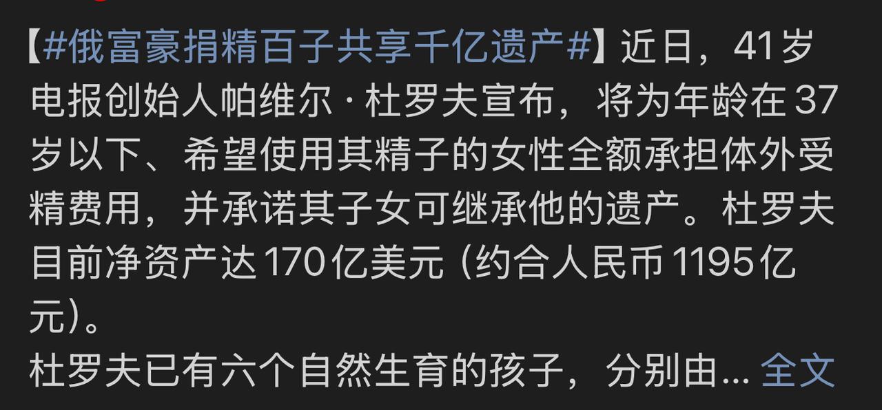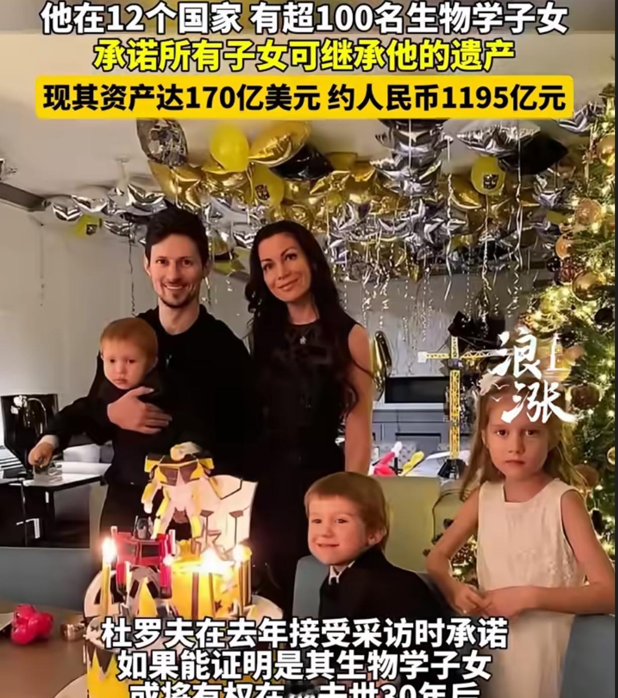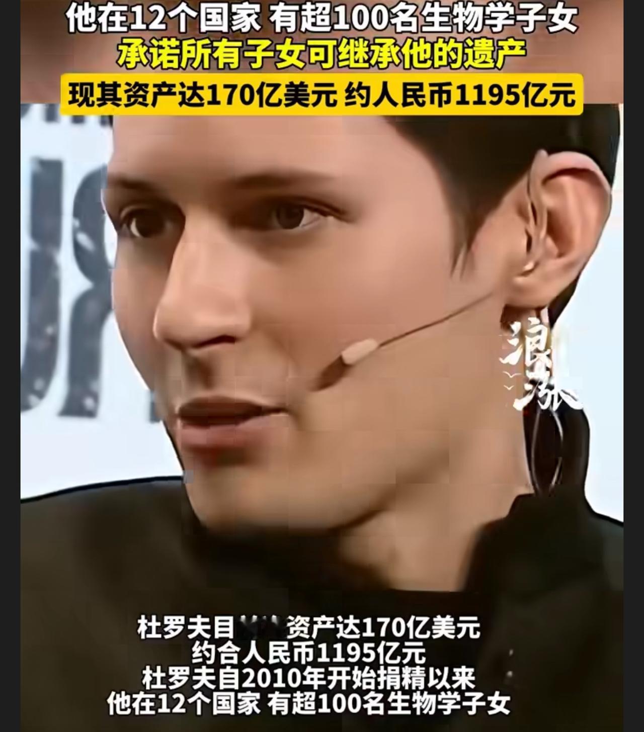 俄罗斯41岁富豪杜罗夫100多个子女冲上热搜! 电报创始人杜罗夫身价高达1195亿人民币,他近日宣布,自己全世界的100多个孩子都可以继承遗产! 从2010年开始,杜罗夫通过生物手段,他在12个国家有超过100多个生物学儿女,而且这些子女有继承自己财产的权利,他后面还会继续这一行为! 这人咋想的,100多个孩子比古代皇帝还能生?