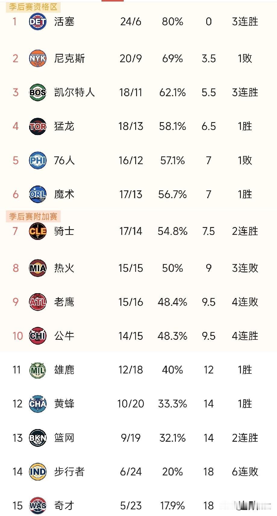 东部现在也是乱成一锅粥,最长的四连胜居然来自排名第十的公牛,雄鹿现在差2.5个胜场了。 排名第一的活塞一波三连胜又把差距拉开了,主要是今天第二的尼克斯输给了森林狼,热火和老鹰一波连败居然还是排名前十。 现在真的不想关注东部球队了,没有看头,关键是没啥流量。你们还有喜欢的球队或者球星在东部吗?