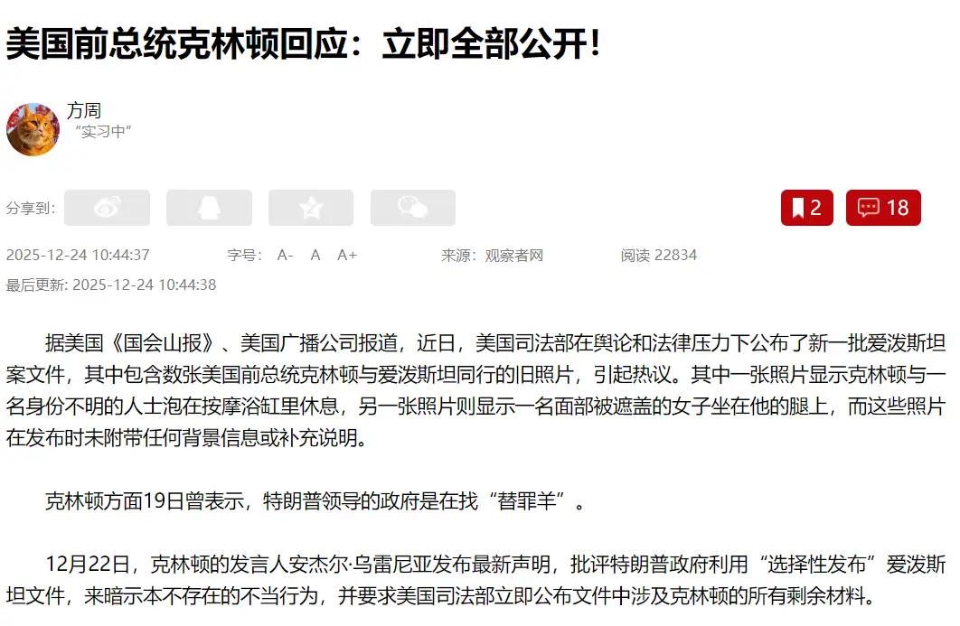 美国前总统克林顿这是要和特朗普“同归于尽”啊。据报道,克林顿办公室副主任安杰尔·乌雷尼亚要求美国司法部立即公布文件中涉及克林顿的所有剩余材料。 之前美国公布的爱泼斯坦案的资料中,前总统克林顿被“曝光”,而特朗普则比较少。现在克林顿要求公布所有文件,看来克林顿信心满满,不愿当爱泼斯坦案的替罪羊,要拉特朗普下水,一起“同归于尽”。