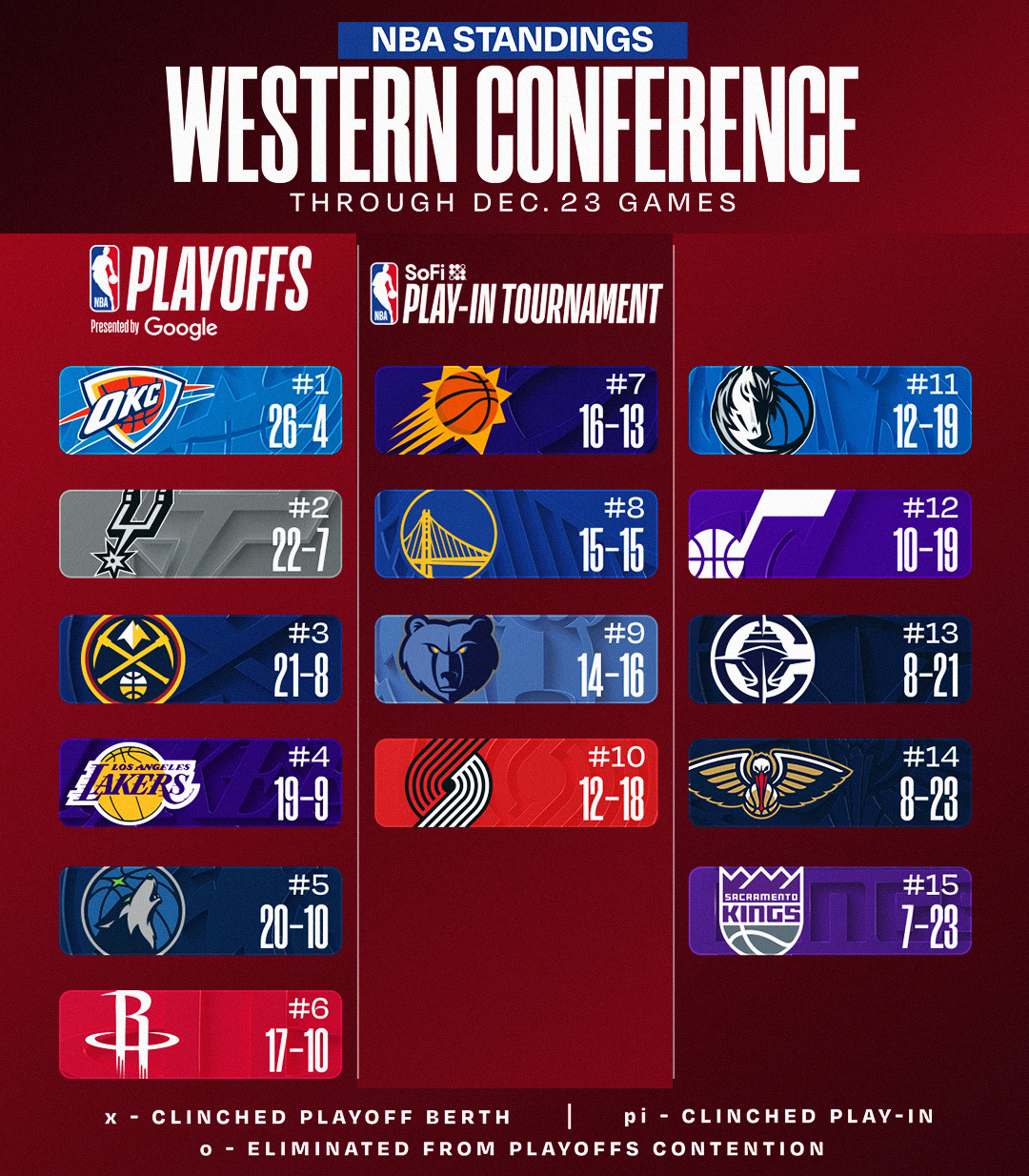 今日赛后东西部排名更新,湖人第四、火箭第六。NBA
