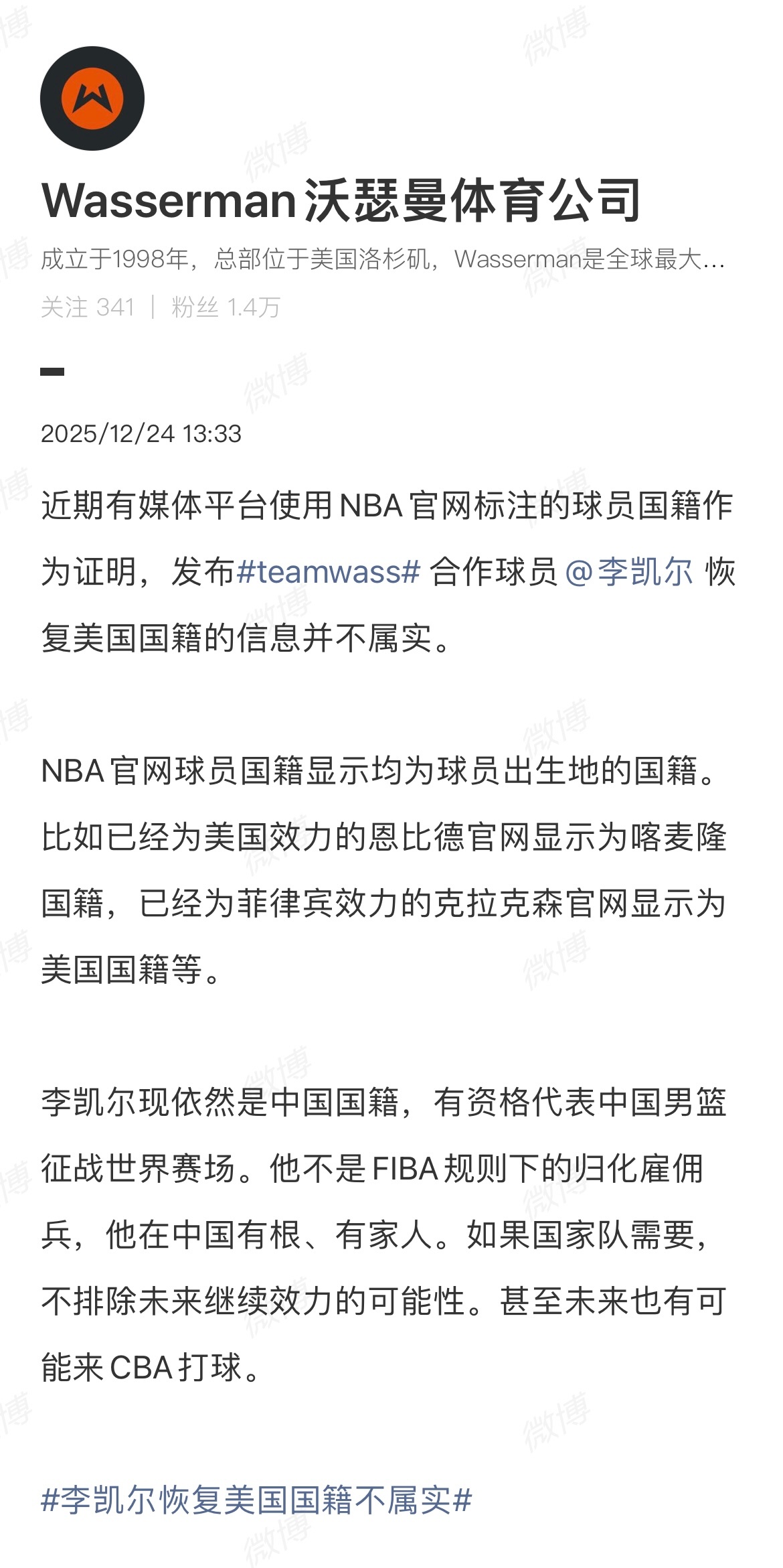 李凯尔的国籍已经更改为美国籍!此前根据媒体透露,归化李凯尔的时候,并没有官方