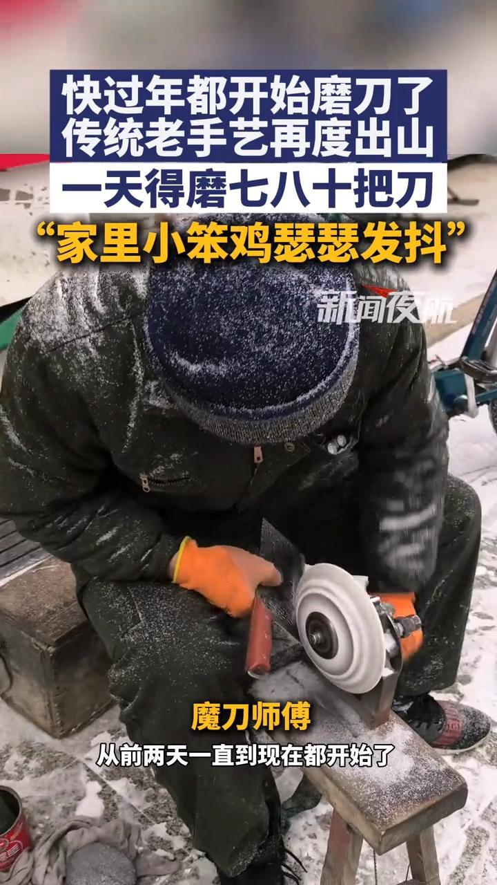 眼看要过年了, 祖传的老手艺又出山了! 一天得磨70多把刀! 离火苗的日子越来越近,黑龙江的一位磨刀师傅,却越来越忙了。 这位师傅称,他从前两天开始,每天都要磨七八十把刀。 大家都想趁着过年前,将家里的刀先打磨好,方便切菜切肉。 师傅说虽然很累,但是收入也多了起来,心里还是挺高兴的。 如果大家家里有磨刀石的话,是可以自己磨的,磨的时候,把握一个要点就可以了,让刀和磨刀石成15到20度的夹角,这样磨起来,事半功倍。