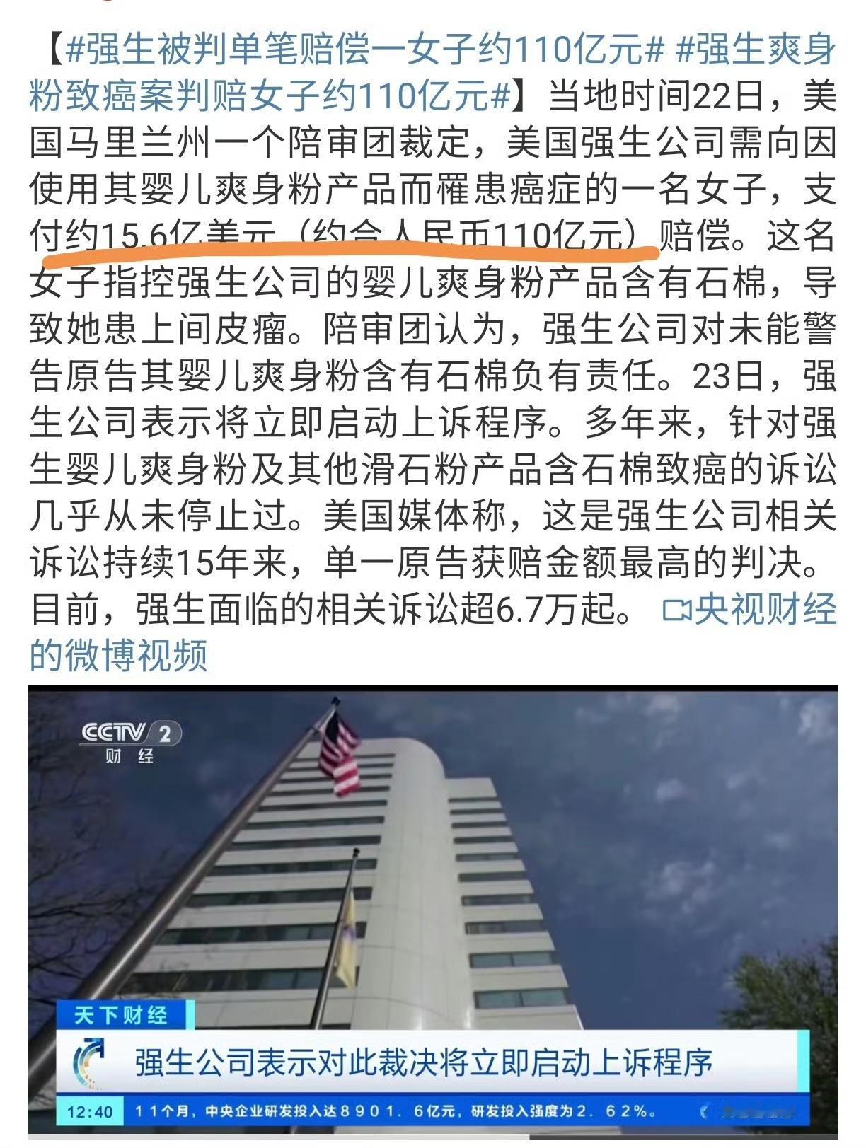 老牌强生婴儿爽身粉塌房!含石棉致女子患癌,单笔赔110亿创纪录,15年诉讼超6.7万起,大牌安全底线不能破! 谁能想到,一罐贴着“婴儿专用”标签的爽身粉,背后藏着长达半个世纪的肮脏秘密。早在1970年代,强生就已检测出滑石粉原料中的石棉污染,却选择系统性隐瞒,任由一代又一代父母将致癌物轻轻扑在孩子娇嫩的皮肤上。 110亿元的天价赔偿,看似是正义的降临,可对那位被间皮瘤折磨的女性而言,再多金钱也换不回健康的身体、安稳的人生。 6.7万起诉讼,30亿美元的和解金,这些触目惊心的数字,不是强生的“止损账单”,而是无数消费者的血泪清单。更讽刺的是,一边是法庭上的败诉与巨额赔付,一边是企业嘴硬“产品安全”的苍白辩解,甚至叫嚣判决“违宪”、指控原告“伪科学”。这种傲慢,比滑石粉里的石棉更让人不寒而栗。 从全球停售含滑石粉产品,到欧盟2027年全面禁售的前瞻监管,再看国内仅“未检出石棉”的宽松标准,监管的温差,让消费者成了最无辜的试验品。那些还躺在家庭药箱里的旧款爽身粉,成了悬在头顶的“定时炸弹”——毕竟石棉的潜伏期长达20到40年,谁也不知道,下一个受害者会是谁。 大牌的光环,从来不是逃避责任的挡箭牌。当资本的贪婪凌驾于生命安全之上,再响亮的名号,也终将在消费者的唾弃中轰然倒塌。这起案件不是终点,它更该是一记警钟,敲醒所有抱着侥幸心理的企业:安全底线一旦失守,千亿帝国也会瞬间崩塌!