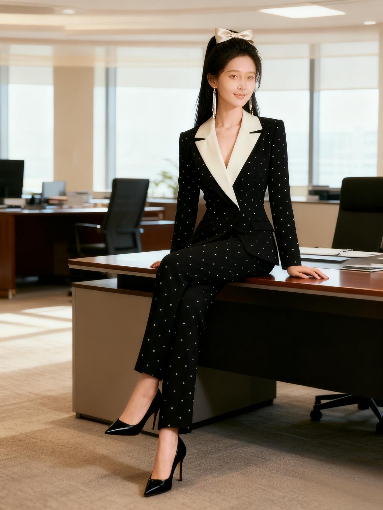 黑白撞色的西装外套,黑色主体搭配米白色翻领,衣身点缀细小的白色圆点,领口为V领设计,增添柔美感,又保留西装的干练气质。