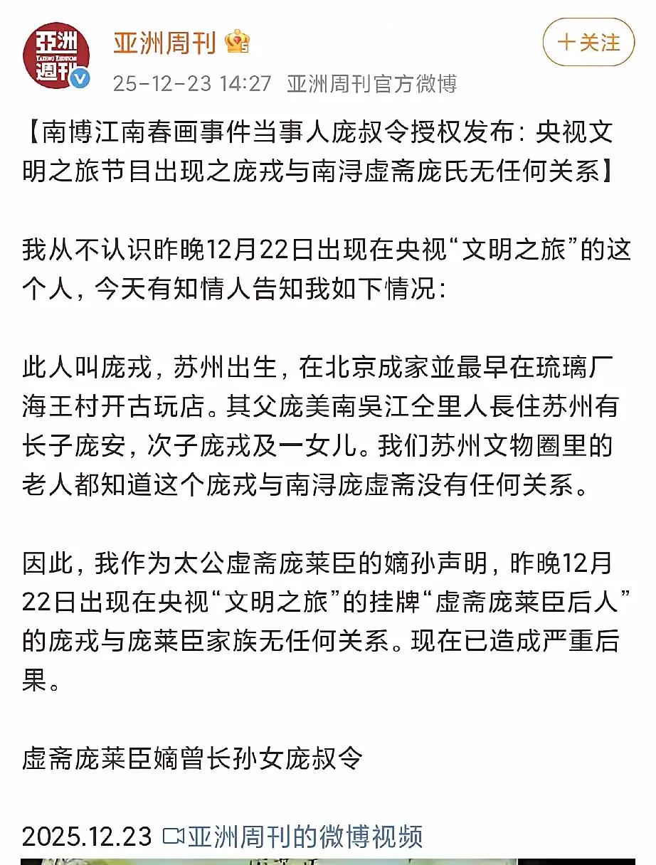 刘芳菲此时采访"庞家后人":是蹭热度翻车,还是文化传播失察? 当国家文物局工作组直奔南京,江苏多部门联合彻查南博文物疑云,8800万天价捐赠画作现身拍卖场的争议正掀翻舆论时,前央视主持人刘芳菲带着"庞家后人"的专访强势登场。这波精准踩在风口上的操作,看似巧合背后,藏着三重耐人寻味的逻辑。 首先是流量密码的精准拿捏。南博137件捐赠文物失踪、"伪作"认定存疑、院方研究员与捐赠家族互撕,一连串戏剧化情节让"庞莱臣旧藏"成为全网焦点。作为以文化节目转型的自媒体人,刘芳菲深谙热点价值——此时绑定"名门后人讲传承"的选题,既契合《芳菲的文明之旅》的文化定位,又能借文物争议的高关注度收割流量,堪称自带话题的传播捷径。事实也印证了这一点,直播中"家族捐赠初心""文物真伪争议"等话题,迅速引发观众共鸣,让节目热度短时间内快速攀升。 其次是文化人设的强化诉求。从央视离职后,刘芳菲一直以"文化传播者"形象深耕自媒体,此前凭借古建筑科普积累了良好口碑。而庞莱臣作为"江南收藏甲天下"的传奇藏家,其家族捐赠文物的故事本身就充满文化厚重感。邀请"后人"讲述家族收藏史与家国情怀,既能丰富节目内容的纵深,又能通过"守护文化根脉"的价值表达,进一步巩固自身专业、有温度的文化人设,与当下公众对文物保护的关切形成情感共振。 但最讽刺的是专业把关的集体缺位,让这场精心策划的文化访谈沦为"翻车现场"。就在直播结束次日,庞莱臣嫡曾孙女庞叔令公开打假,直指受访嘉宾庞戎与南浔庞氏无任何血缘关系,其身份造假在江苏文物圈早已是公开秘密。作为资深媒体人,刘芳菲团队未核查家谱、未向嫡脉后人求证,便轻率为嘉宾贴上"庞氏后人"标签,让节目从"文化传播"异化为"流量消费"。这背后,或许是蹭热度心切导致的仓促上阵,或许是自媒体时代"速度优先于真相"的浮躁心态,最终让文化情怀沦为流量的牺牲品。 这场争议早已超越单纯的节目翻车:当捐赠家族忙着追查文物去向、国家全力彻查文物安全时,冒牌后人借势出镜,文化节目沦为流量道具,本质上是对文物尊严的漠视,对公众信任的消耗。文物安全需要国家彻查的"双保险",文化传播更需要真实性的"硬底线"——没有严谨核查的文化表达,再动人的传承故事,也只是经不起推敲的空中楼阁。 国家文物