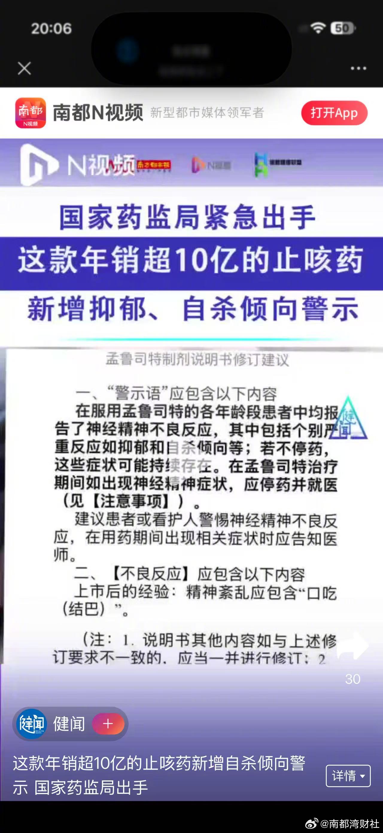 【#这款年销超10亿的止咳药新增自杀倾向警示#,国家药监局出手】为进一步保障公众用药安全,12月23日,国家药监局决定对孟鲁司特制剂(包括孟鲁司特钠片、孟鲁司特钠咀嚼片、孟鲁司特钠颗粒和孟鲁司特钠口溶膜)说明书内容进行统一修订。南都N视频记者注意到,孟鲁司特制剂说明书修订建议中新增“警示语”,个别严重反应涉及抑郁和自杀倾向。不良反应内的精神紊乱内容中应包含“口吃(结巴)”。网页链接