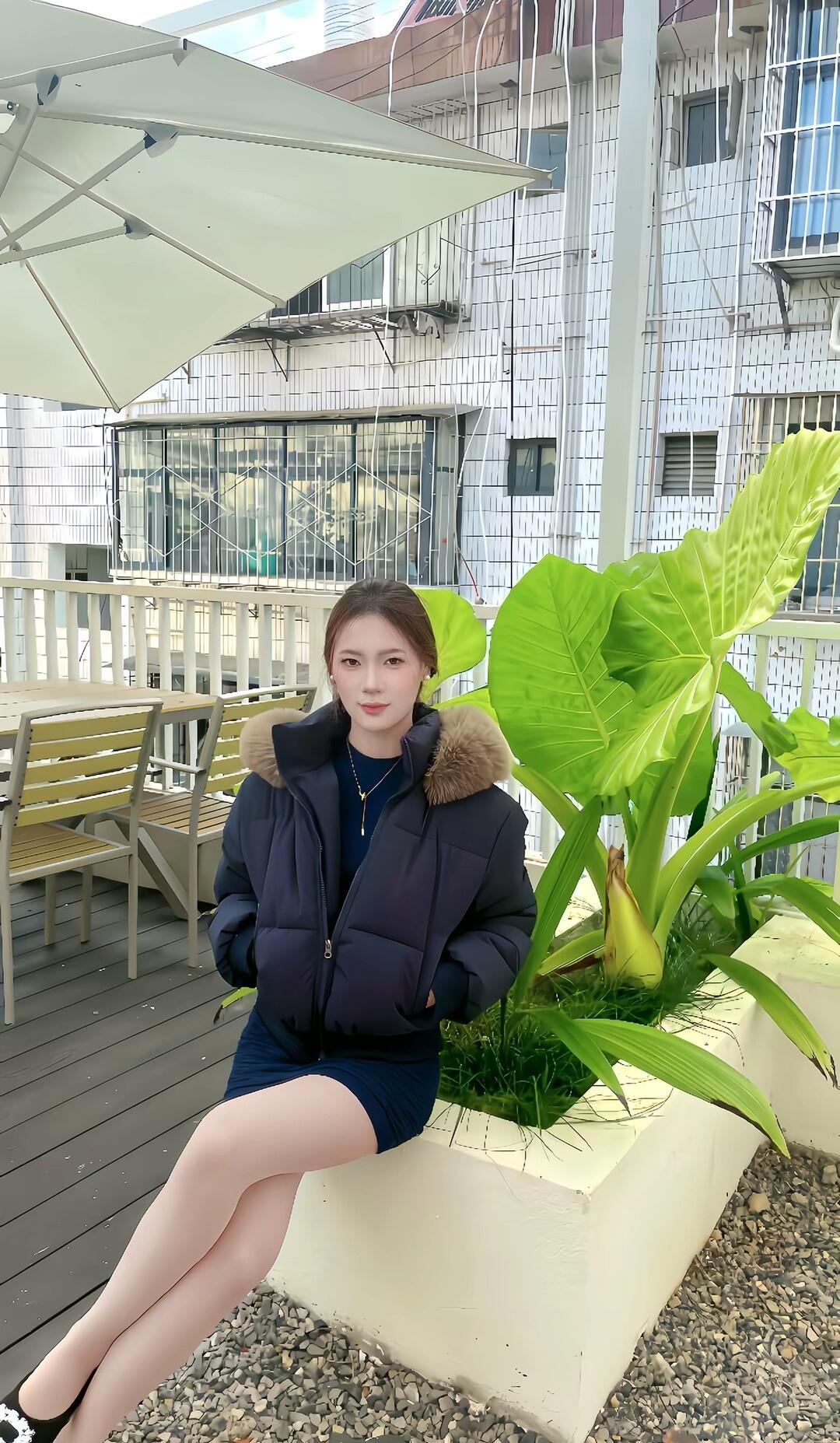 冬日暖阳下,时尚女孩与绿植相伴,尽显冬日暖意。