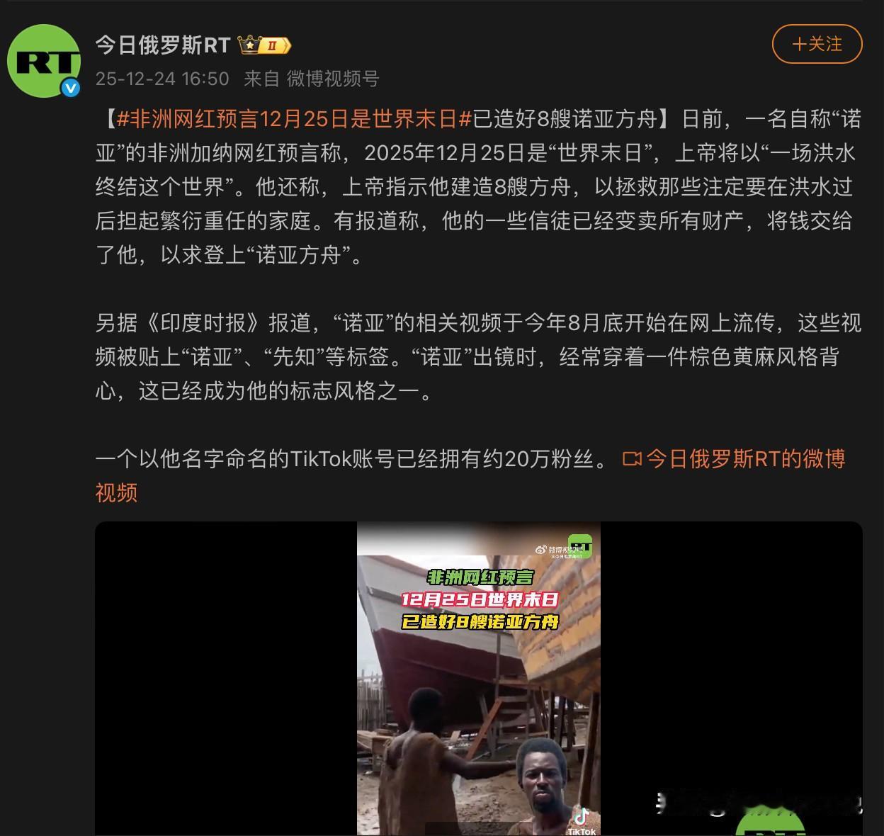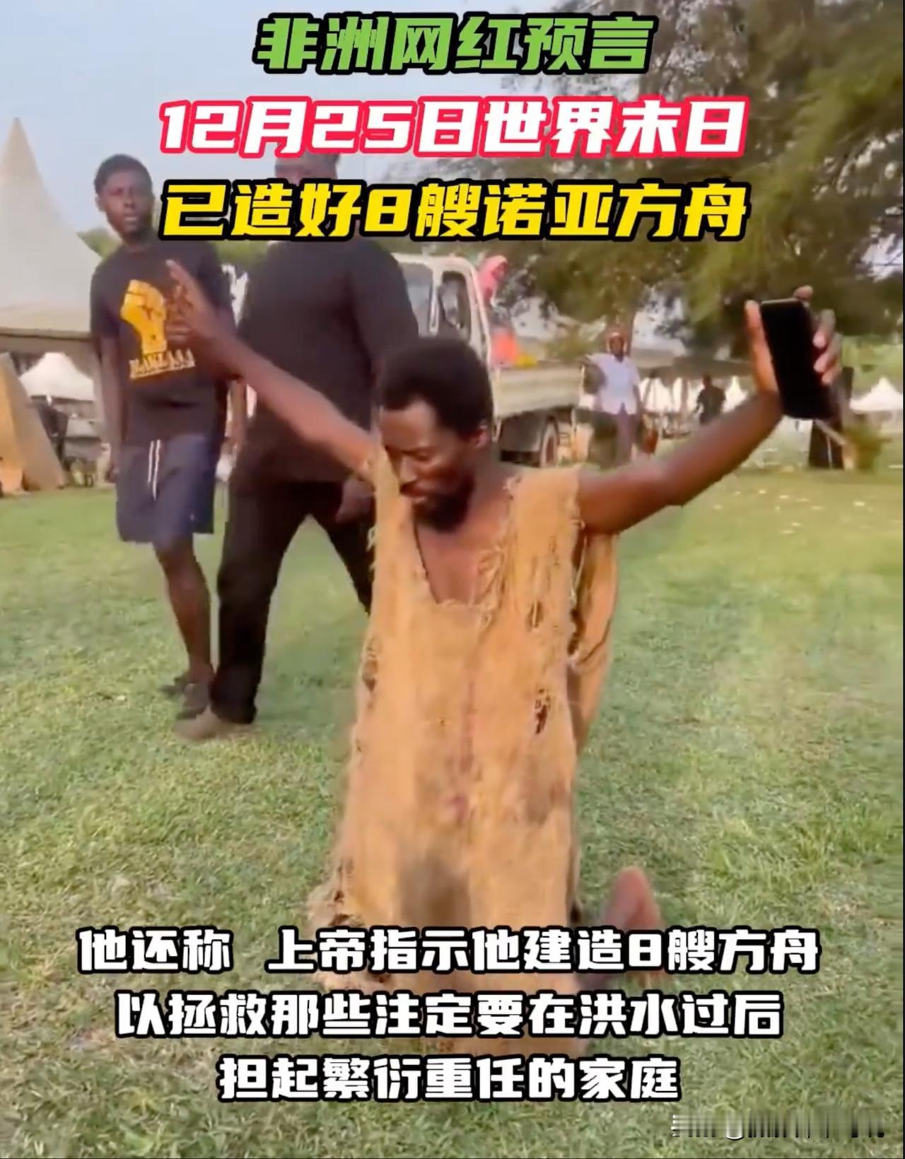 非洲小伙说明天世界末日,然后居然有人真信了!今天看到一条十分炸裂的新闻,一非洲网红小伙自称受到上帝启示说明天也就是12月25日要世界末日了。上帝将会用一场大洪水终结这个世界。然后还指示他建造8艘诺亚方舟以拯救幸存者,然后关键有人居然相信了,而且还有些信徒把家产变卖了,把钱交给了这位非洲小伙儿,算是船票费吧!看到这条新闻后,当时我就震惊了,先不说这些人的脑瓜子有没有问题,就说这8艘诺亚方舟是认真的吗?就这小体格,我国沿海随便一艘小渔船都能自称为超级诺亚方舟了!我还是建议这哥们儿千万不要把自己的诺亚方舟给印度网友看见了,否则人家会觉得这载人量还不如一辆摩托车。嗯,不说了,我也去打包行李,时间不多了![捂脸]