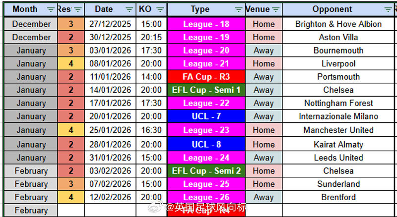 【阿森纳新年艰苦赛程】在圣诞节过后,直至2月上旬,40多天的时间,阿森纳四线出线(英超、欧冠、足总杯第3轮,联赛杯半决赛),一共要踢14场比赛,平均三天多一点就要踢一场比赛。重点对手:英超:维拉、利物浦、曼联欧冠:国米联赛杯:切尔西*2