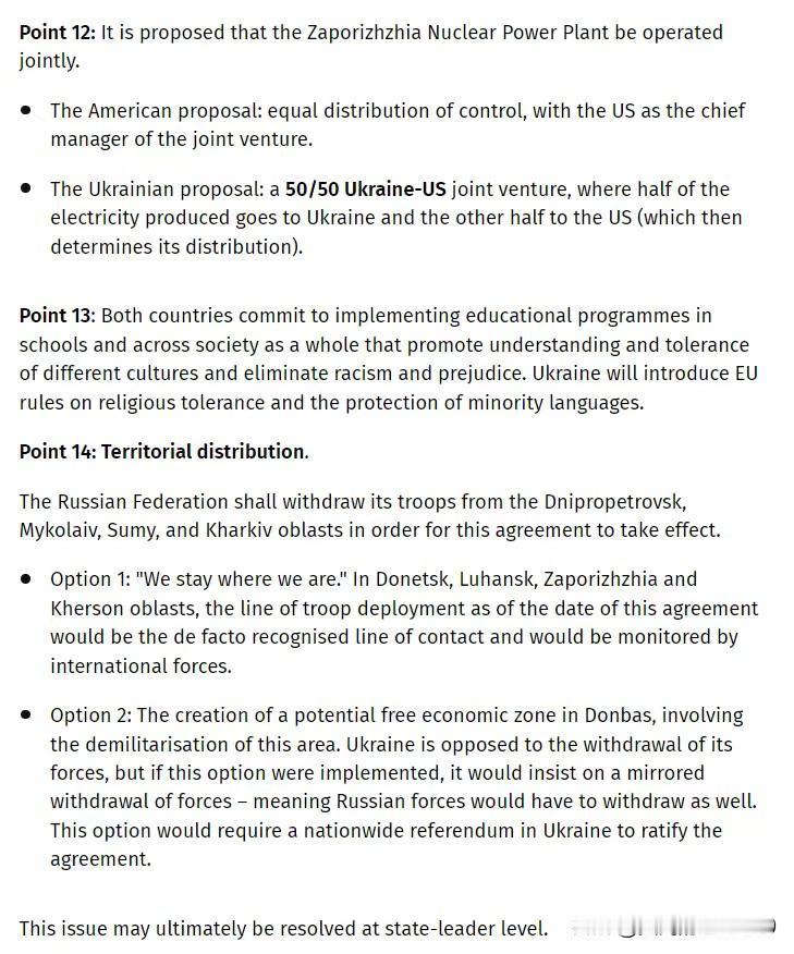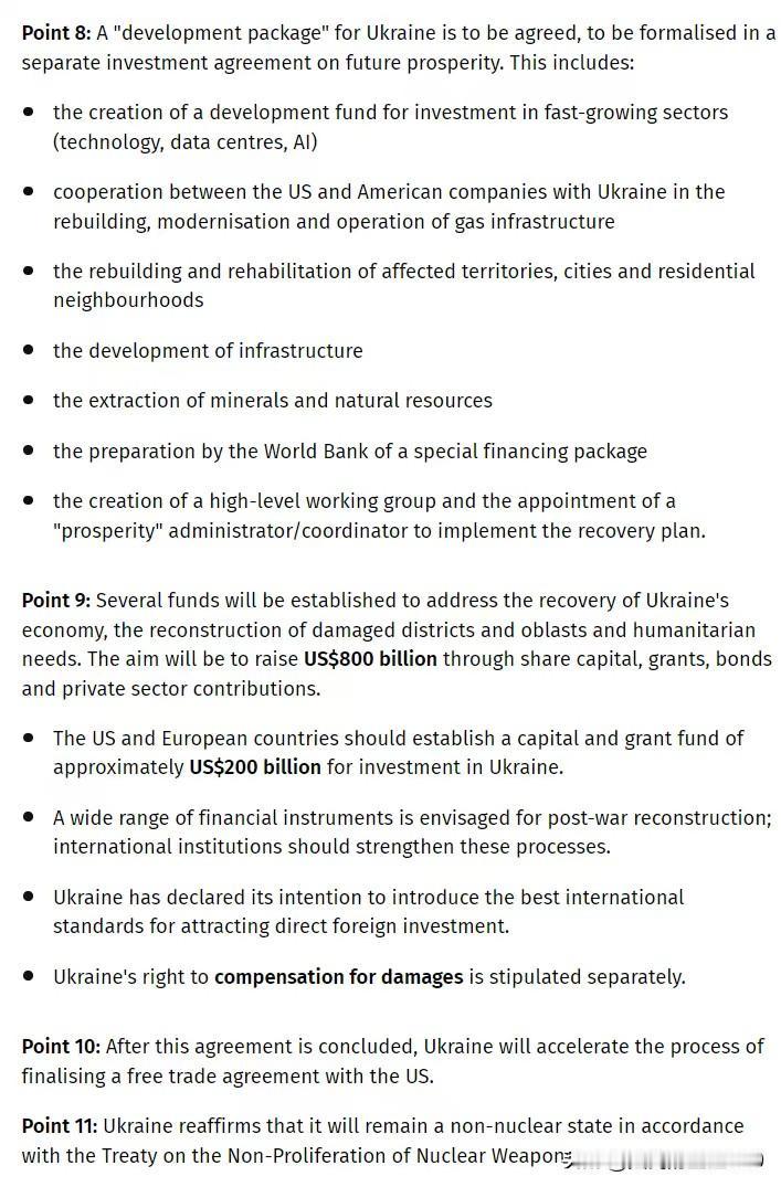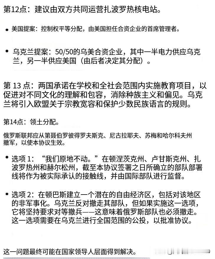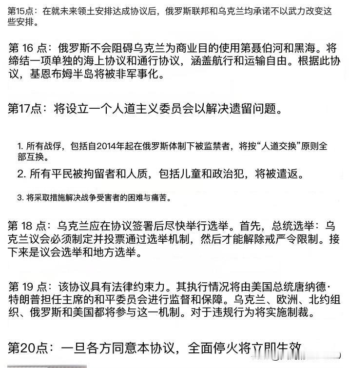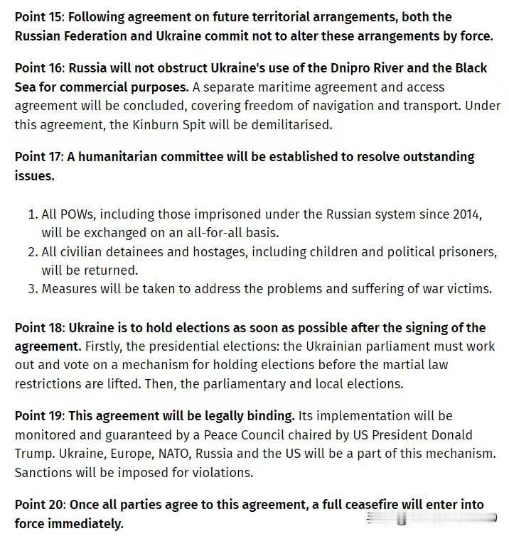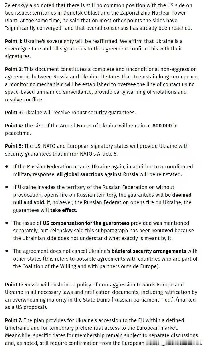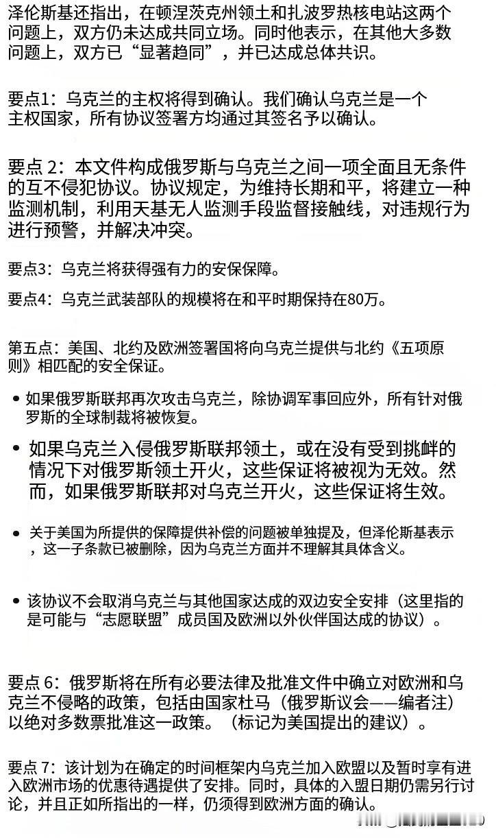 泽连斯基提出的所谓与美国,欧洲制定的20点“和平计划”完全是一份“一厢情愿”的和平计划,根本没有考虑到俄罗斯一直以来的诉求。即便表面看着做出了相当大的努力,但在根本问题上并没有得到解决。 泽连斯基在发布“这份20点和平计划”的同时表示,这份计划文件是乌克兰、美国、欧洲与俄罗斯之间达成共识的框架性文件,也是双方合作的基础依据。 泽连斯基说,该草案体现了乌克兰与美国在许多领域的共同愿景。其中部分内容反映了美国方面的立场,但他也表示,仍有若干条款需要进一步商讨和达成一致。 泽连斯基还指出,在顿涅茨克州的相关领土问题以及扎波罗热核电站的问题上,双方仍然没有达成共识。不过他表示,在其他大多数问题上,双方的观点已经“显著趋同”,总体而言已经形成了共识。 另外,泽连斯基还表示,在美方与俄罗斯方面进行会谈之后,预计俄罗斯方面会于12月24日对这份草案作出回应。 泽连斯基说,“这样我们就能明确接下来的行动步骤,以及某些决策可能所需的时间框架。我们已准备好与美国举行高层会晤,以解决那些敏感问题。像领土争端这样的问题,确实需要在领导层层面进行讨论。” 除了“基础文件”之外,泽连斯基还表示,为结束这场战争所需要的其他相关材料也在同步准备中。这些材料包括一个多边安全保障框架(涉及乌克兰、美国和欧洲各方),以及美国提供的双边保障机制。 泽连斯基还表示,这套保障措施包括一份军事附件,其中详细列出了在俄罗斯再次发动侵略时应采取的安全机制及应对措施。泽连斯基指出,这份文件旨在在合作伙伴的支持下,帮助乌克兰建设成为一个强大的国家;同时,其中也包含了监测各方是否遵守和平协议的机制,以及在对违规行为采取行动时应遵循的明确规定。 他还指出,乌克兰与美国已经共同制定了一份关于恢复经济与发展前景的文件,也就是所谓的“乌克兰繁荣发展路线图”。 不过,按照泽连斯基发布的这份“和平计划”来评估,与其说这是一份所谓的“和平计划”,不如说,这是一份单方面的“自娱自乐”的计划,俄罗斯方面根本不会同意。即便是“和平计划的框架”,很多条款也不符合俄罗斯的利益,更不符合俄罗斯长期以来的根本诉求。