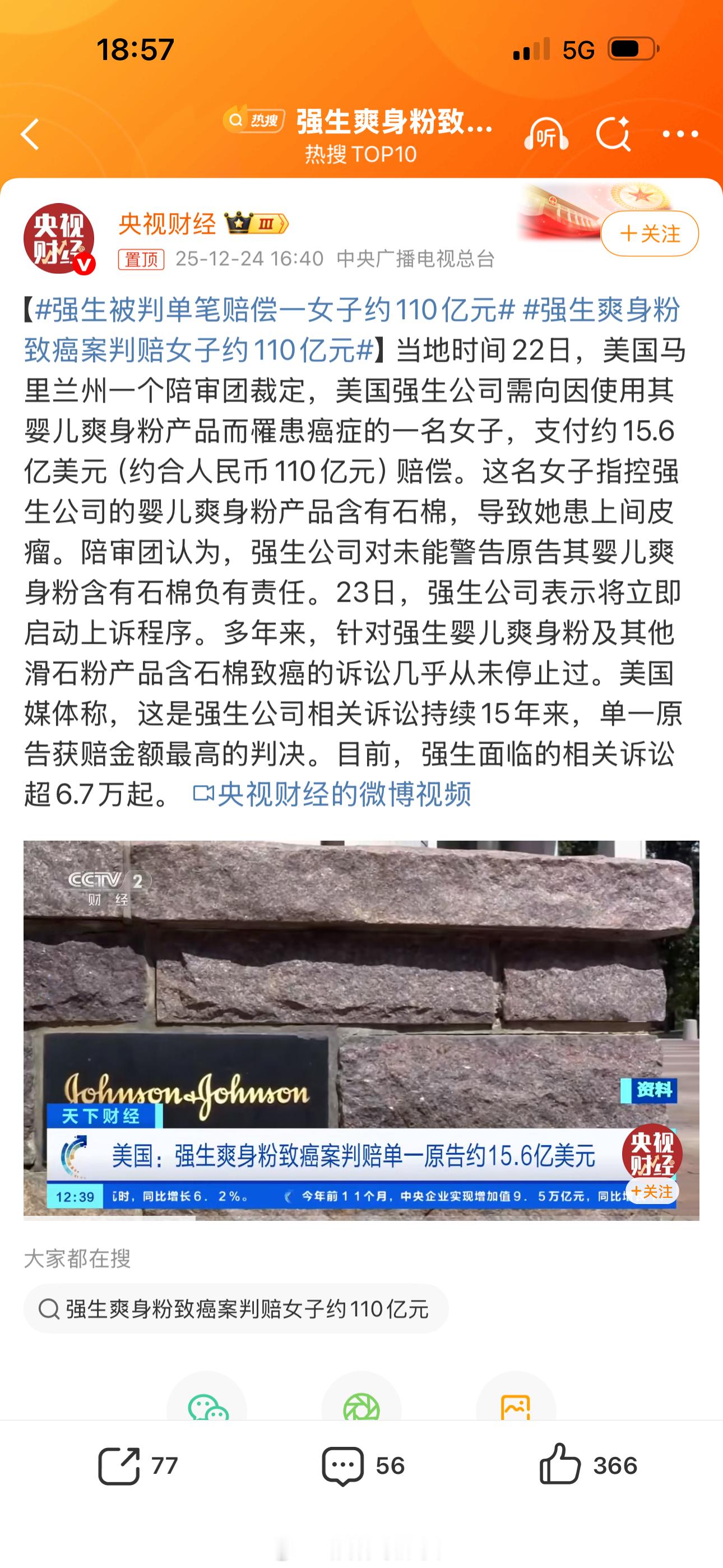 强生爽身粉致癌案判赔女子约110亿元虽然知道这事应该是发生在外地,但110亿元这赔偿金额也是吓到我了!不过对不良商家就应该罚到它倾家荡产哭爹喊娘,国内企业就是缺这个所以才能有恃无恐!