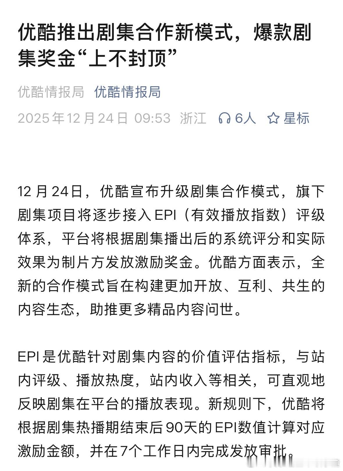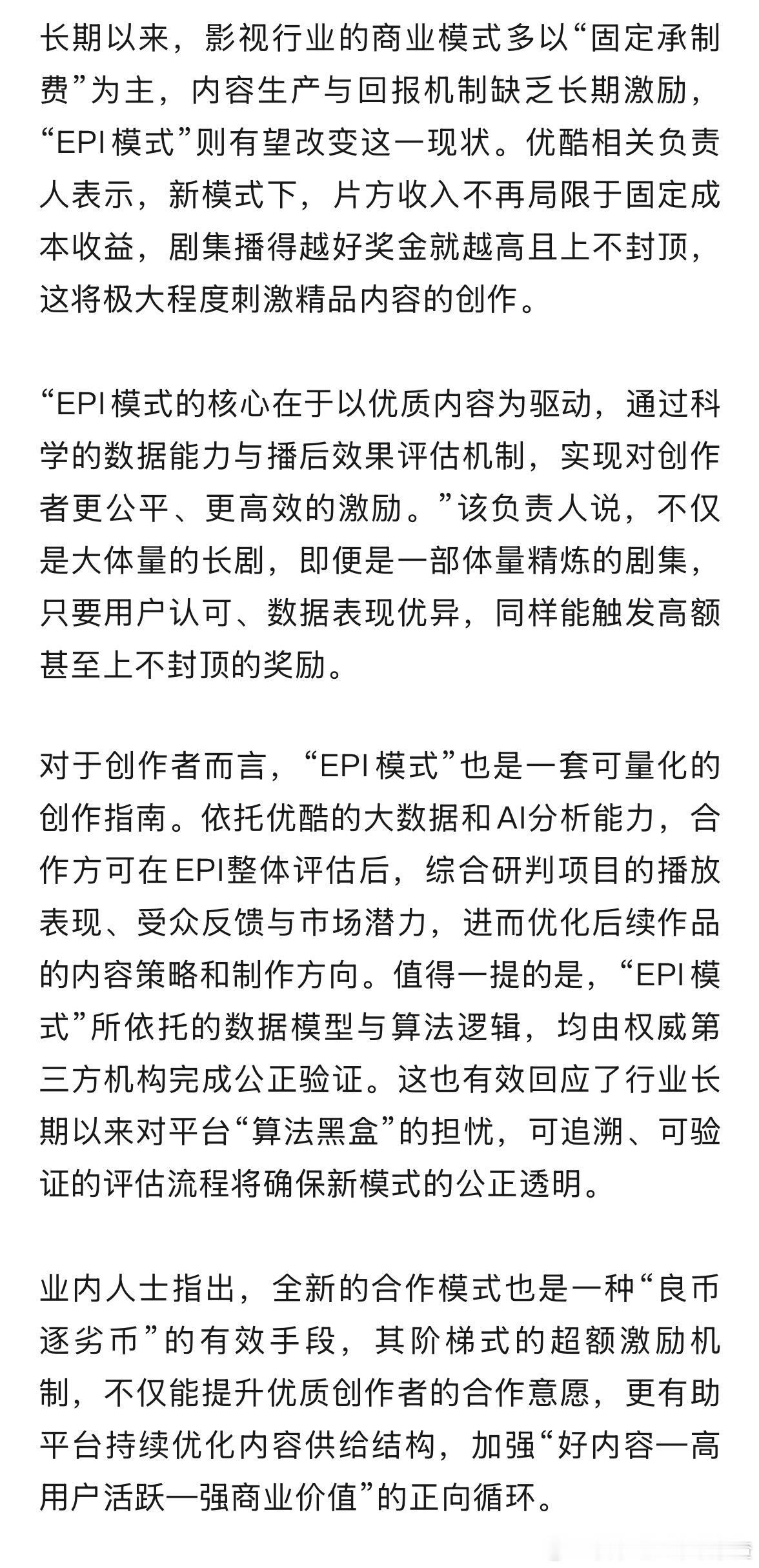 优酷宣布升级剧集合作模式,旗下剧集项目将逐步接入EPI(有效播放指数)评级体系,平台将根据剧集播出后的系统评分和实际效果为制片方发放激励奖金